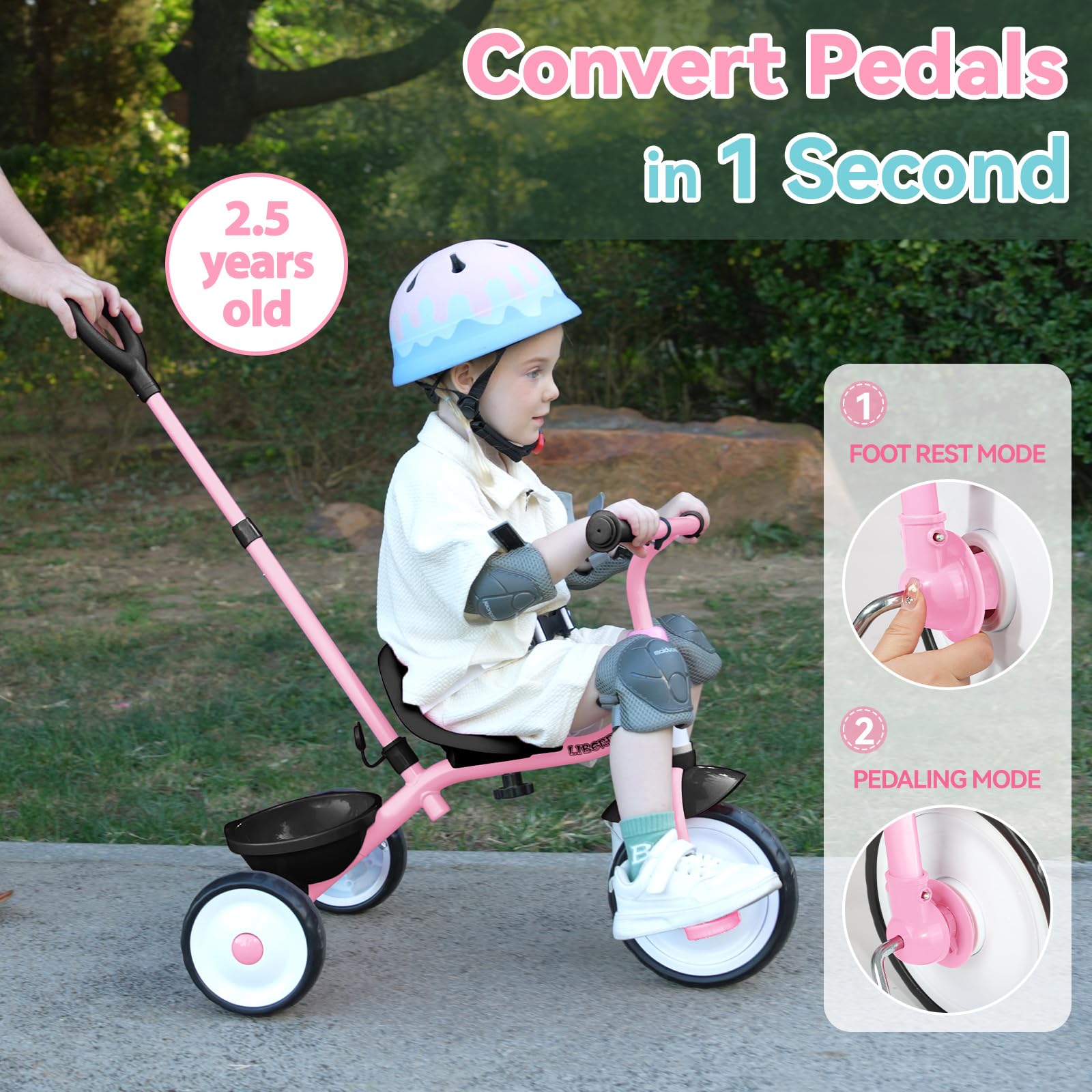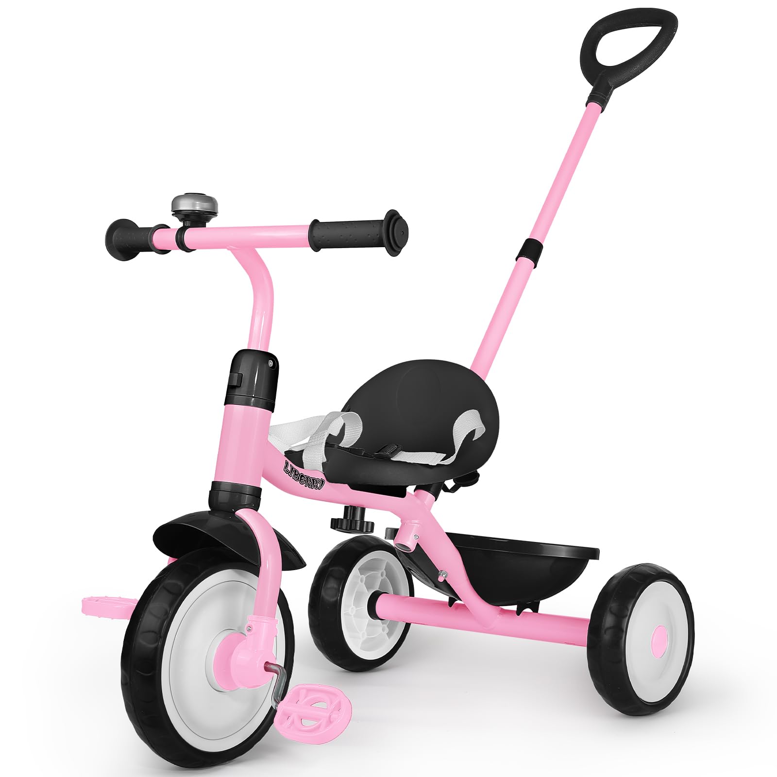 Description: Features: 2-in-1 Design: Liberry three wheel bike functions both as a parent-push tricycle for younger toddlers and a child ride-on tricycle for older kids, adapting to different developmental stages. Adjustable Handle Push Bar: The girls bike features a three-gear adjustable push handlebar, making it comfortable for parents to guide and control the toddler bike during walks. Safe Kids Tricycle: Prioritizing kids' safety, our baby bike includes a stable triangular structure, a 60 steering limit on the handlebars and a secure safety seat belt to prevent falls and rollovers. Sturdy Construction: Built with a durable steel frame and finished with non-toxic paint, ensuring a safe and long-lasting ride. Comfortable Riding Features: The toddler riding toy is equipped with non-slip handlebars, a clutch pedal that locks the pedal to prevent turning, and a cozy seat, all designed for your child's comfort. Convenient Storage: This push tricycle comes with a rear seat basket, great for carrying toys, snacks, or other essentials on the go. Smooth Indoor & Outdoor Use: Lightweight EVA tires provide a silent and smooth ride. Easy Installation: Our toddler tricycles 2-4 years has a simple structural frame. Refer to the accompanying instructions, you can complete the installation in a few minutes. Function: Enhances Motor Skills: Helps toddlers develop balance and coordination, promoting physical activity and motor skills. Growing Partner: Riding our 3 wheel bike allows your child to experience the sense of accomplishment of riding independently, which helps build self-confidence and promote growth in other areas. Gift Idea: A great gift for toddlers, offering them a fun way to explore their surroundings and enjoy active play. Package Includes: Our ride on toy comes with Toddler tricycle 1, screwdriver 1, Wrench 1, Instruction 1.