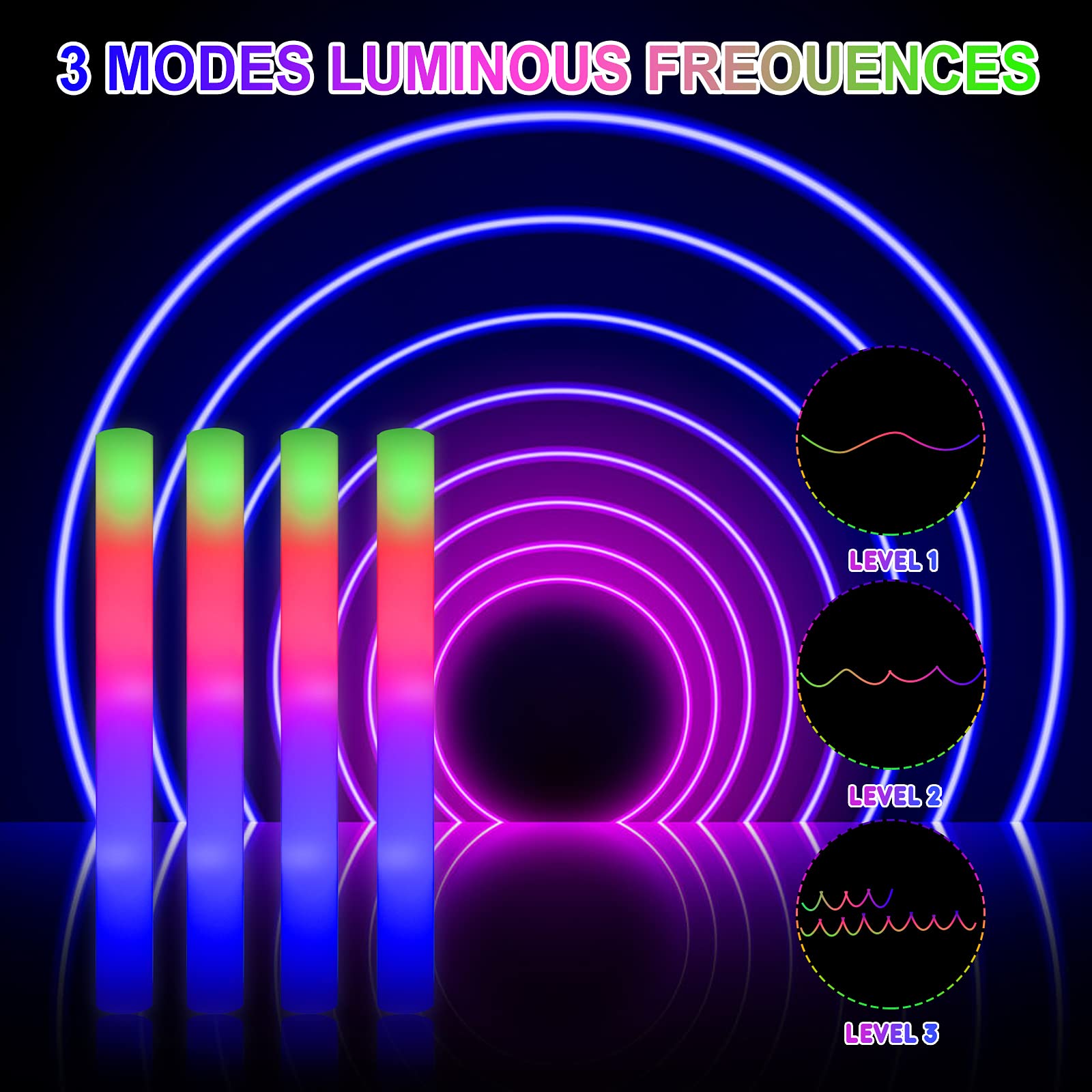 - Q: What are the different light modes available for the LifBetter foam glow sticks? A: The LifBetter foam glow sticks feature three distinct light modes: quick flashing, slow flashing, and alternately flashing in vibrant green, red, and blue colors. You can easily switch between these modes by pressing the power button.