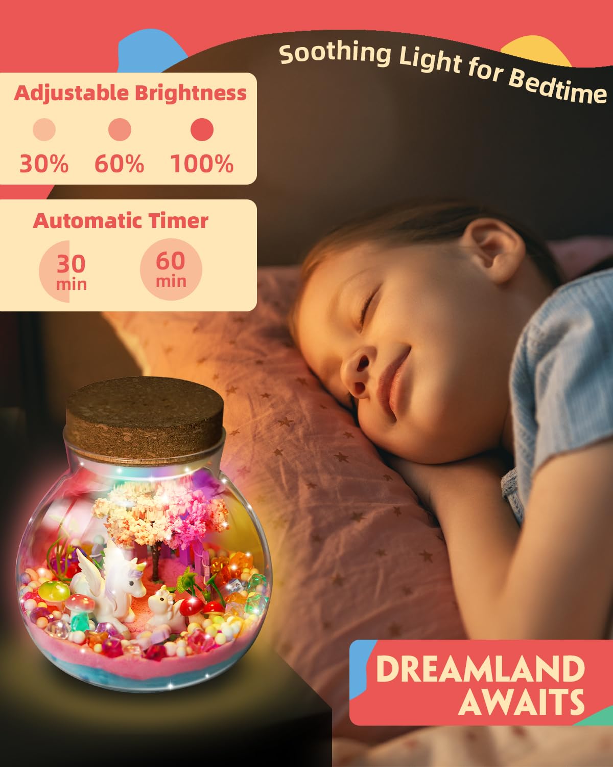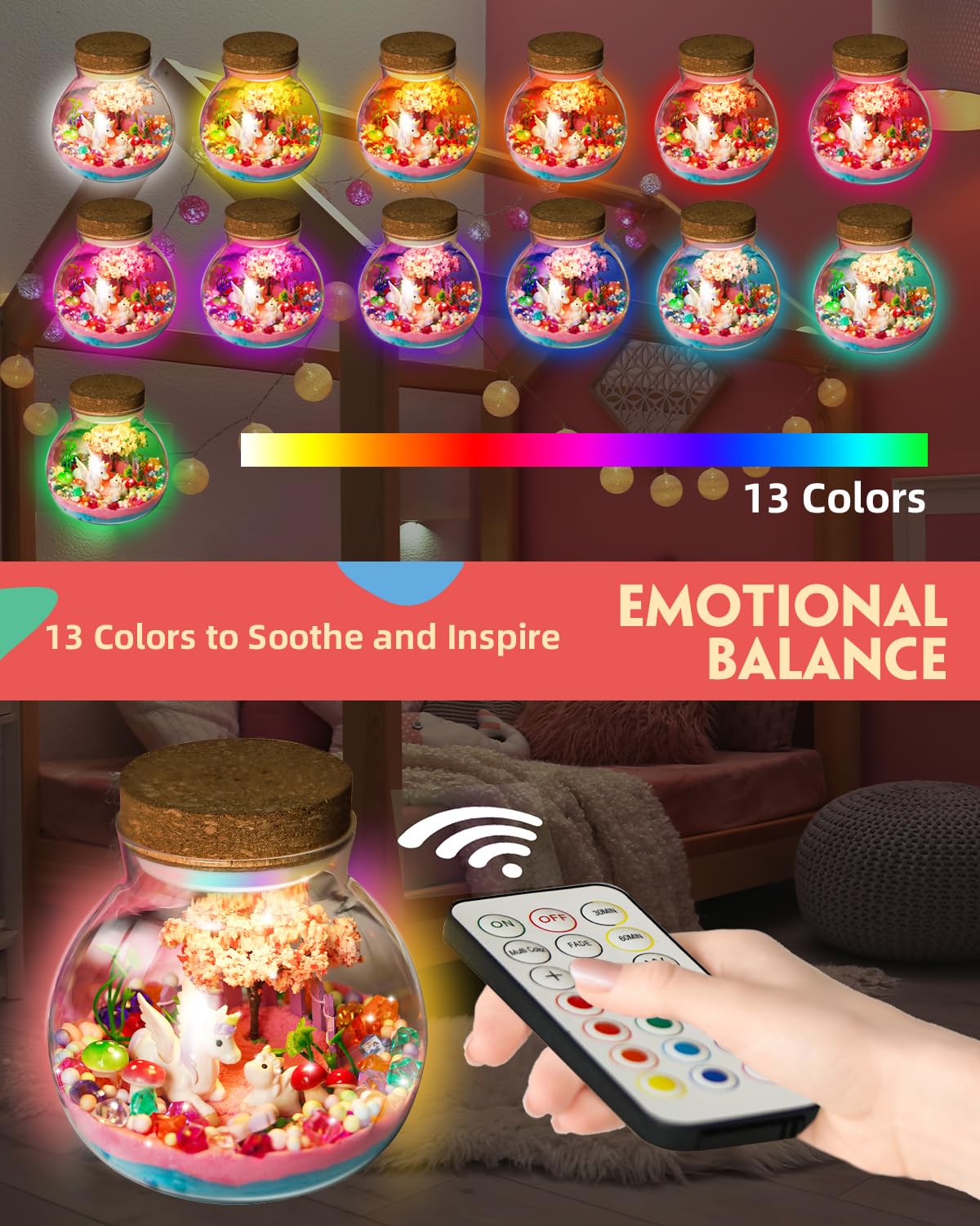 - Q: What materials are included in the unicorn terrarium kit? A: The kit includes clear jars, a 13-color LED night light with a remote control, unicorn figures, sparkling crystals, magic sand, cherry blossom trees, flowers, mushrooms, and various decorative ornaments to create a magical unicorn garden.