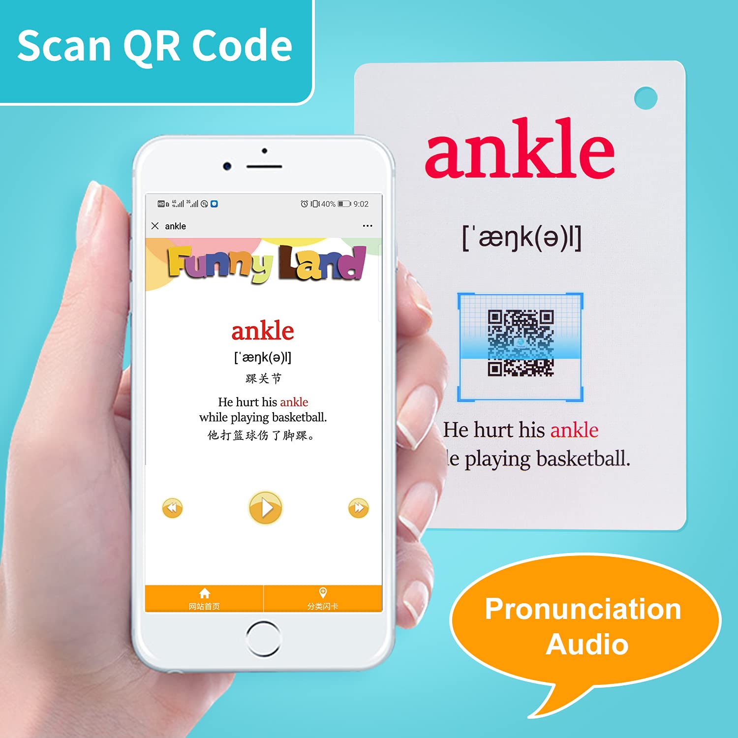 - Q: How do the QR codes on the flash cards enhance learning? A: Each card includes a QR code that, when scanned, provides the pronunciation of the word in a complete sentence. This interactive feature helps deepen understanding and retention of vocabulary.