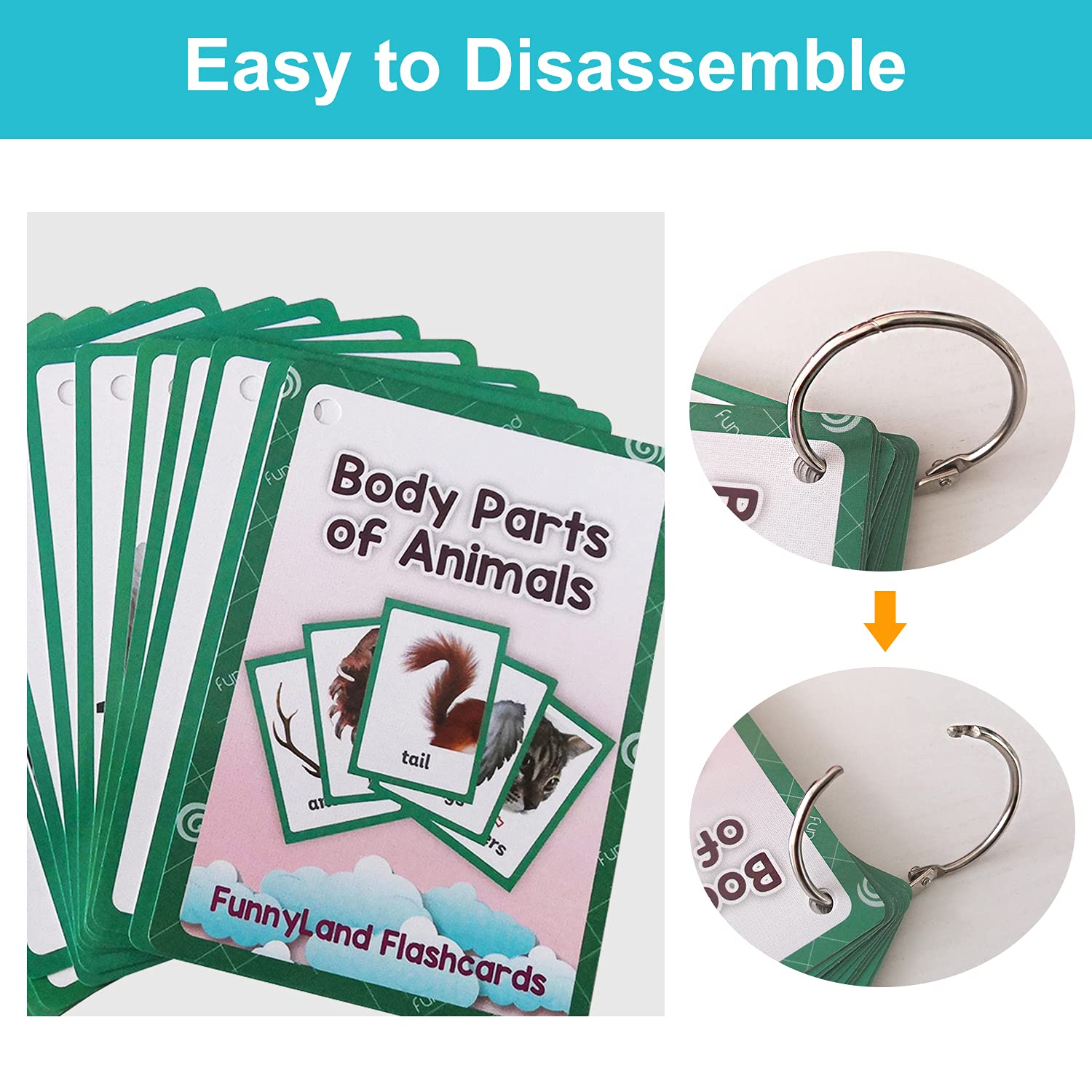 Main Information:1. Theme of Cards: Body Parts of Animals.2. Handheld size 4.3 X 3.14 inch, 11 X 8 cm.3. 360g whiteboard paper, double sided film, waterproof.4. HD pictures and example sentences deepen the memory of words. This is a tool for enlightening English learning.Note:1. Due to the light and screen setting difference, the item's color may be slightly different from the pictures.2. Please allow a slight dimension difference due to different manual measurements.3. The opening and closing of the metal ring is laborious, children are forbidden to operate, please operate by adults.