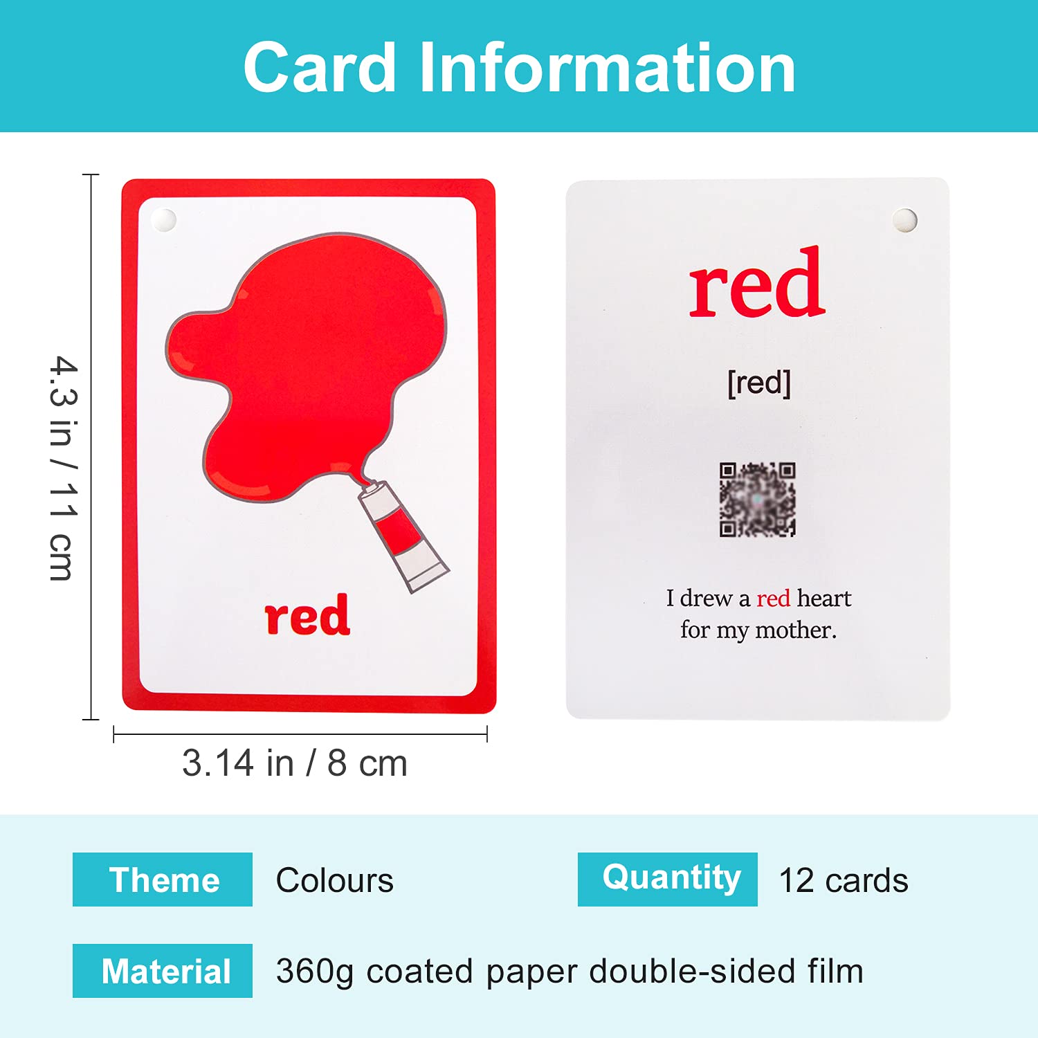 Main Information:1. Theme Of Cards: Colors.2. Handheld Size 4.3 X 3.14 Inch, 11 X 8 Cm.3. 360G Whiteboard Paper, Double Sided Film, Waterproof.4. Hd Pictures And Example Sentences Deepen The Memory Of Words. This Is A Tool For Enlightening English Learning.Note:1. Due To The Light And Screen Setting Difference, The Item'S Color May Be Slightly Different From The Pictures.2. Please Allow A Slight Dimension Difference Due To Different Manual Measurements.3. The Opening And Closing Of The Metal Ring Is Laborious, Children Are Forbidden To Operate, Please Operate By Adults.
