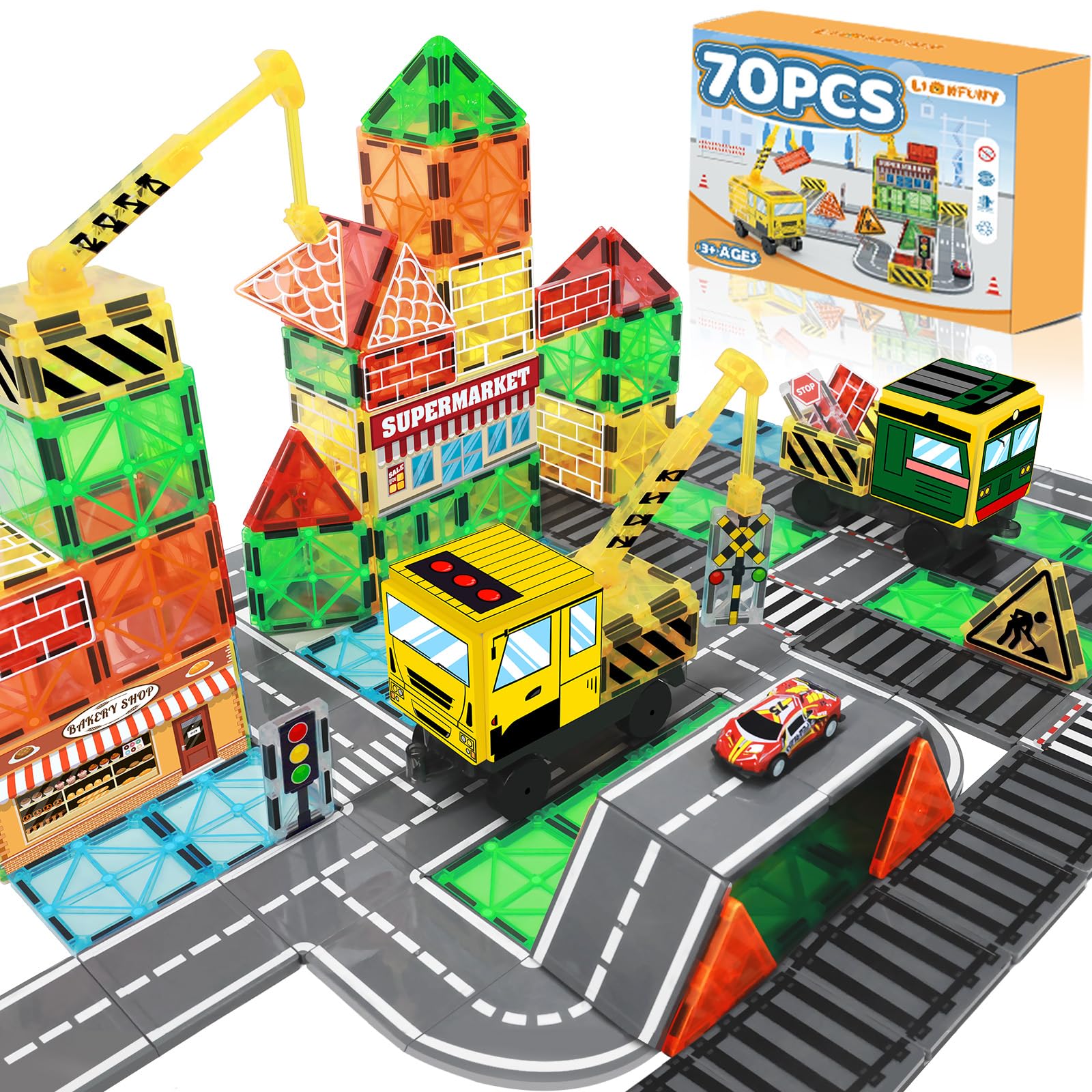 - Q: What unique features does the LionFuny Magnetic Tiles set offer? A: This set features a 2-in-1 design with dual themes of engineering vehicles and trains, along with 70 pieces including magnetic cranes, traffic signs, and roads, providing a diverse and engaging play experience for children.