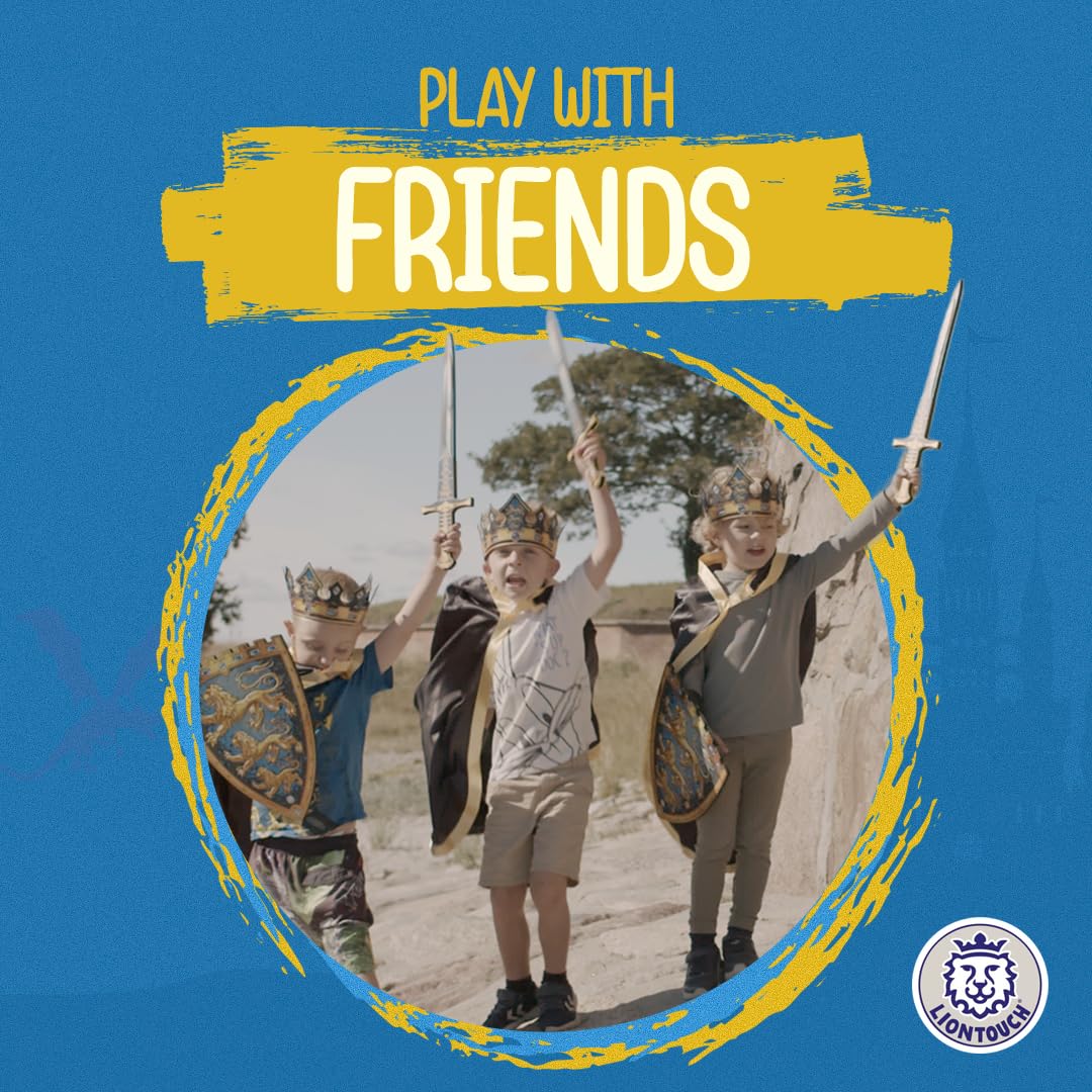 The Triple Lion Crown is an integral part of our series centered around a grand castle in a desolate wilderness. This crown is worn by the king who rules not just as a monarch but also as a brave knight defending his realm with valor honor and hope. | Encourage outdoor pretend play with Liontouch Triple Lion line for kids between 3 and 8 years fostering creativity and social skills as children explore adventures with friends free from screens and digital distractions. | Featuring safe flexible EVA foam the Triple Lion decorative replica blade shield and crown ensure children can fully immerse in make-believe battles while prioritizing their safety during thrilling outdoor play. | Perfect for various occasions like Halloween costume parties or themed events the Triple Lion line adds a regal touch to any outfit making playtime even more exciting and unforgettable. | Exhibiting Danish design and quality Liontouch's Triple Lion line seamlessly blends aesthetics and functionality providing exceptional durability and style in each of its imaginative products.