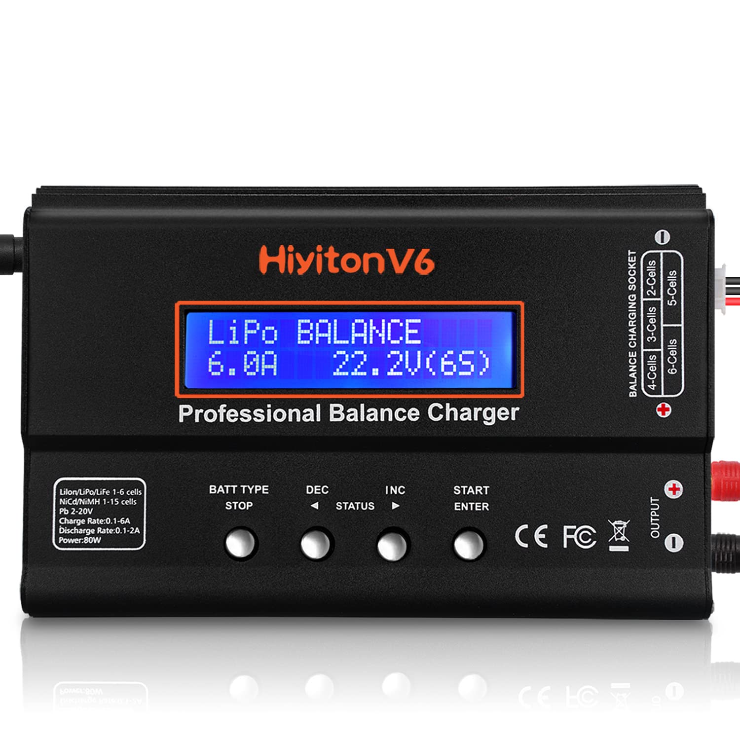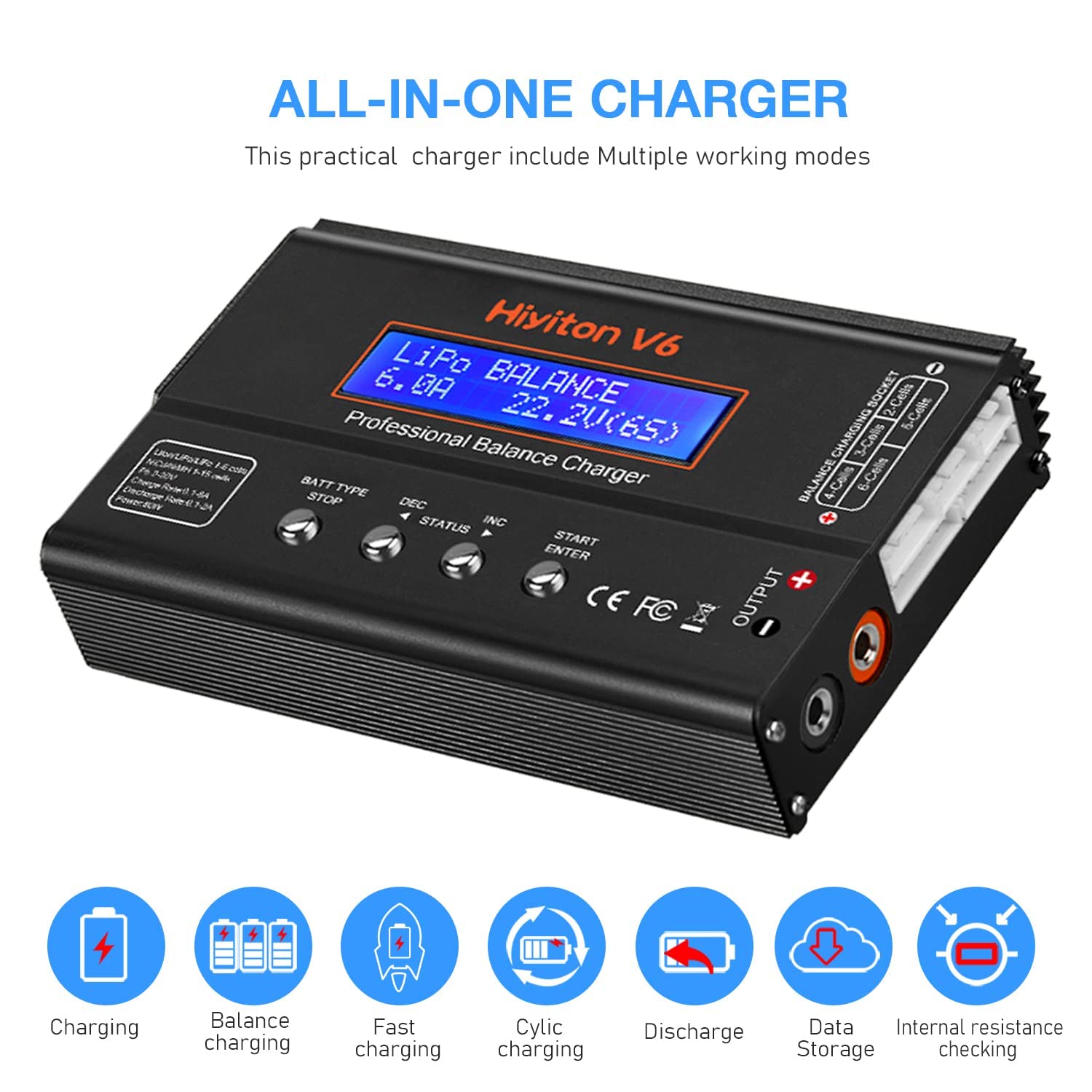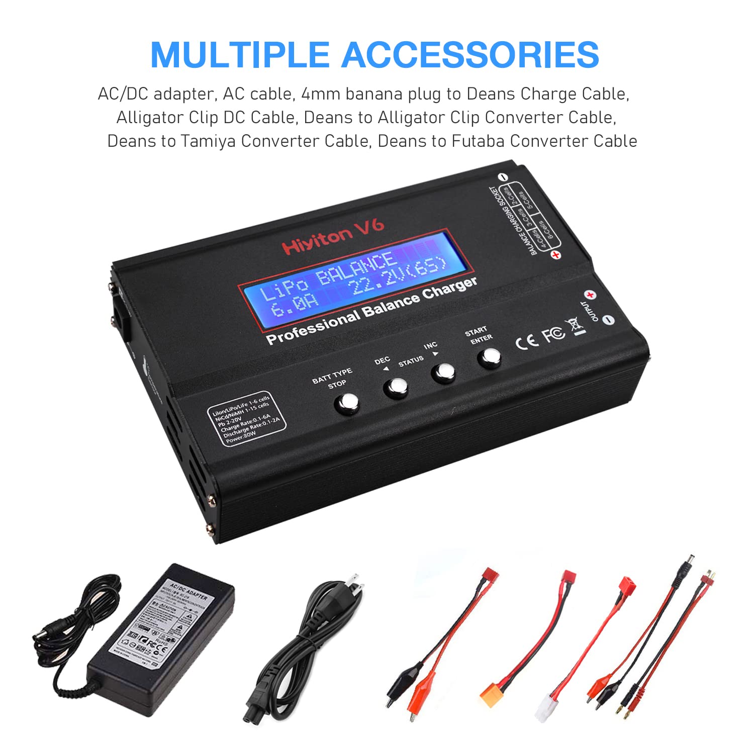 - Q: What is included in the package when I purchase this charger? A: The package includes the V6 battery charger, an adapter, an AC power cable, a DC cable, a T-Crocodile clip, an XT60 plug, a 4mm to Deans charge cable, a Tamiya cable, and a manual, providing everything you need to get started.