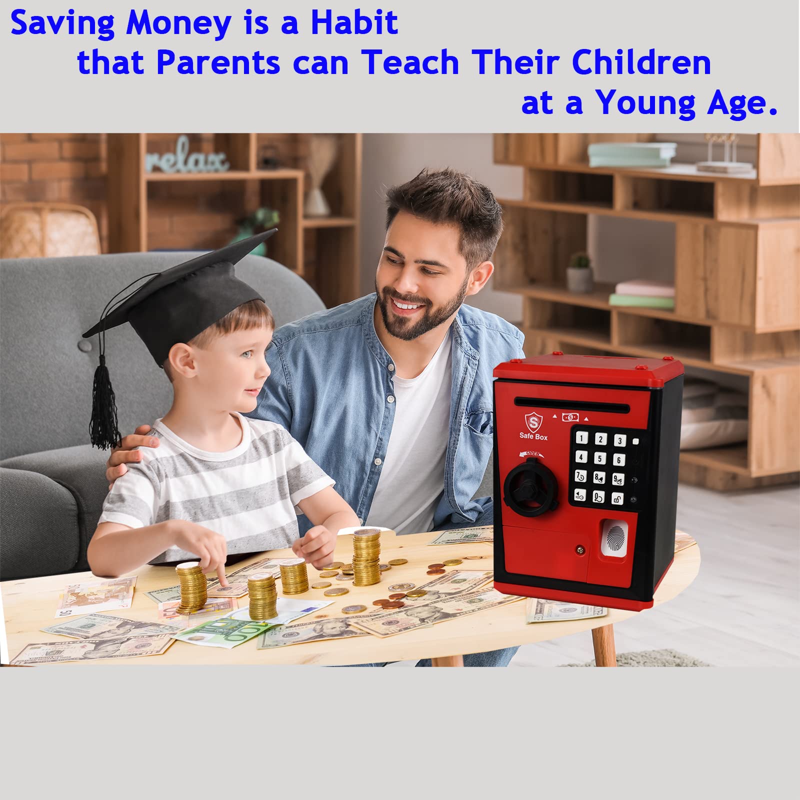 - Q: What safety features does this piggy bank offer for children? A: This piggy bank features a rounded design and is made from durable plastic, making it safe for children to use. It also has a 4-digit password protection system, an alarm that sounds if the safe is left open for more than 15 seconds, and records the first three opening times to ensure kids can see if someone has accessed their items.