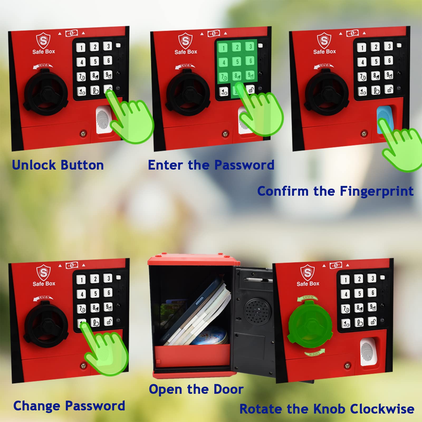 - Q: How does the fingerprint confirmation feature work on the Litpggy Kids Safe Bank? A: The fingerprint confirmation feature on the Litpggy Kids Safe Bank is designed for kids, as actual fingerprint identification isn't effective for children. Instead, it simulates the fingerprint process, adding an interactive element to the safe. Kids can press their finger against the sensor to confirm their identity before entering their 4-digit password.