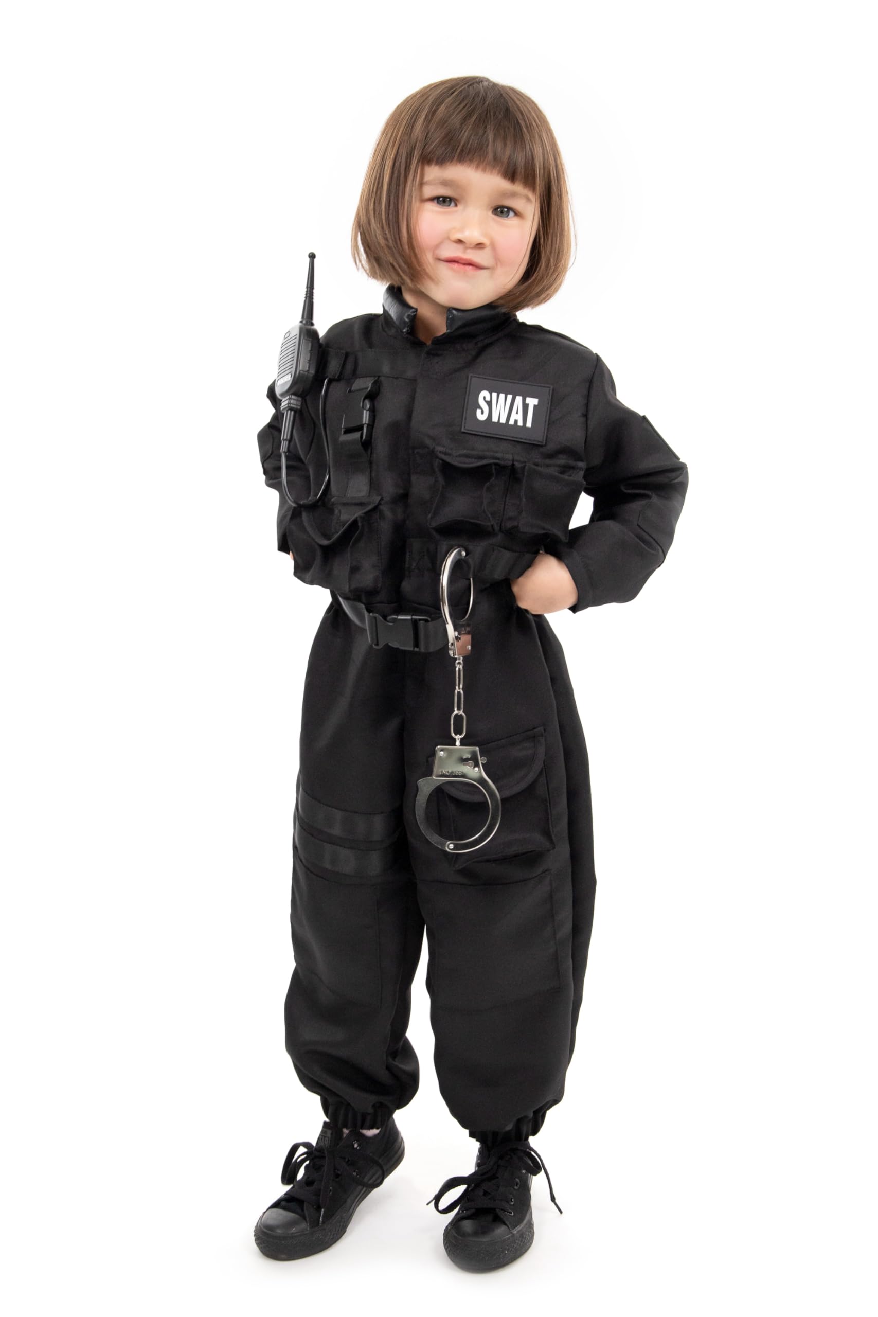 Gear up for action-packed adventures and get ready to tackle any mission with courage and style in this SWAT set. One-piece jumpsuit with black buckles and pockets. Authentic-looking patches and emblems. Comes with play toy handcuffs & plastic toy walkie talkie. Breathable, Silky Soft, 100% Polyester Fabrics. COMFORTABLE - WASHABLE - EVERYDAY PRINCESSES - BECAUSE CHILDHOOD IS AN ADVENTURE!!! Do you have a TRADITIONAL princess that loves tea parties, dancing, baby dolls and wearing princess dresses, but can't stand the itchy, uncomfortable fabrics or seams? Or is your princess the INDUSTRIAL type - preferring water fights to tea parties, running over walking, and living in their dress ups, but can outplay any princess dresses available? Then Little Adventures is your answer. Designed by two moms, Jenny and Heather, with little prince & princesses of their owns - Little Adventures products are DRESS UPS MADE FOR EVERYDAY PLAY! Heather and Jenny were frustrated with the fact that dress ups couldnt be washed. The fabrics would fall apart in the washing machine and many were made to be dry-cleaned only, an absolutely absurd idea for a practical mom. They knew there had to be a better way! So Little Adventures began! MACHINE WASHABLE All Little Adventures Dress -Ups and costumes are durable and machine washable. Messes from an outdoor picnic, jumping in puddles, or every day play? No Problem! Just toss in the wash, dry and you're good to go again. Let the adventures begin! (Additional accessories sold separately.)