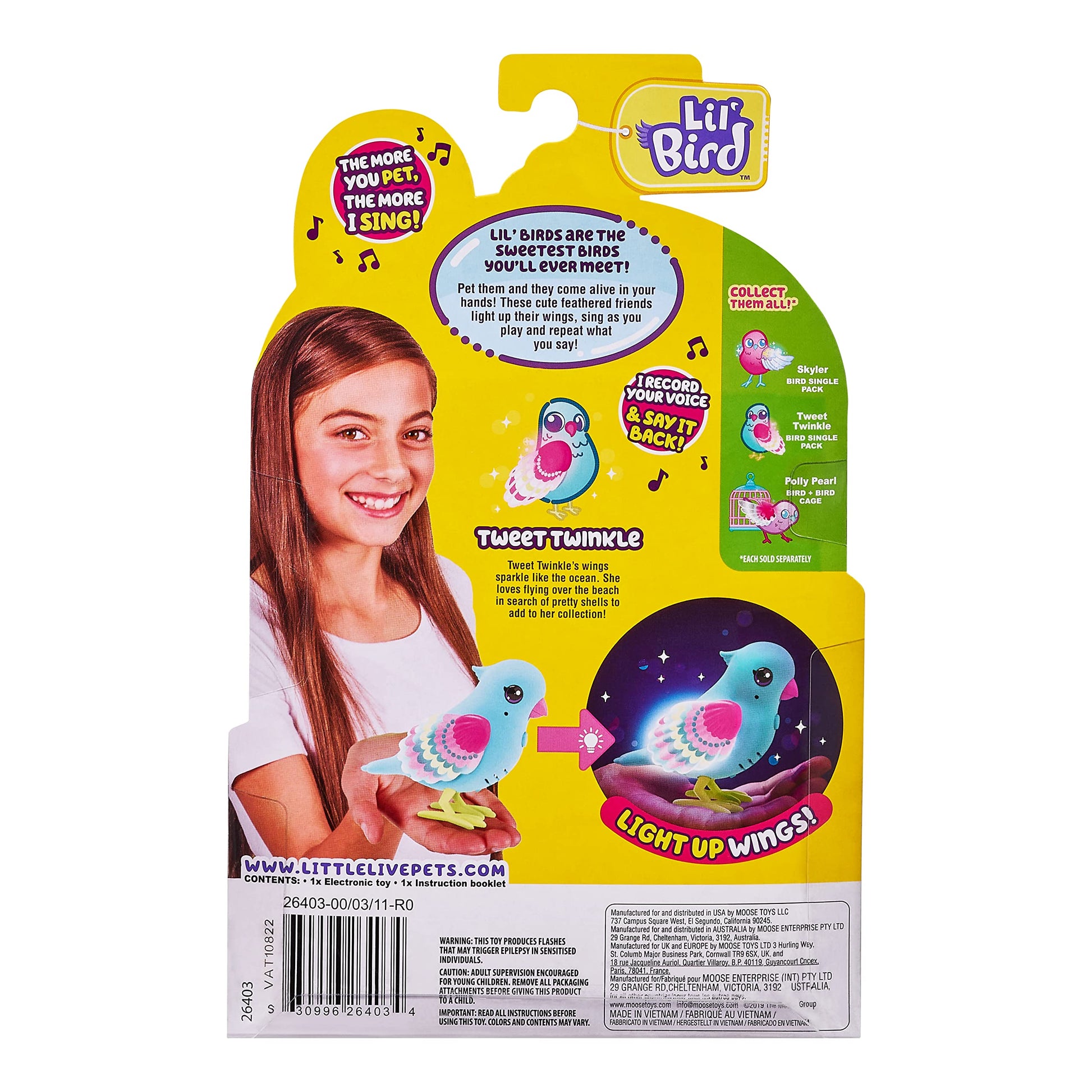 Little Live Pets - Lil' Birds are the sweetest birds you'll ever meet! These adorable little birds with big beautiful eyes and bright light up wings, come to life in your hands as you pet and interact with them. Meet Tweet Twinkle- Tweet Twinkle's wings sparkle like the ocean. She loves flying over the beach in search of pretty shells to add to her collection! Gently stroke Tweet Twinkle's back and she will tweet. She really reacts to your touch! The more you pet, the happier your Lil' Bird will get! Tweet Twinkle will chirp and tweet for longer and eventually whistle a tune for you! She loves to chat and repeat what you say! Press her talk button on her chest and say your message. Tweet Twinkle will immediately repeat your message back to you! These colorful toy birds will brighten your day with over 20 bird sounds to sing! Tweet Twinkle has sparkly ocean inspired light up wings. Collect the other Lil' Birds! Each one has decorations and features on their wings and faces that relate to a certain theme. Get them all to form your own fabulous flock!