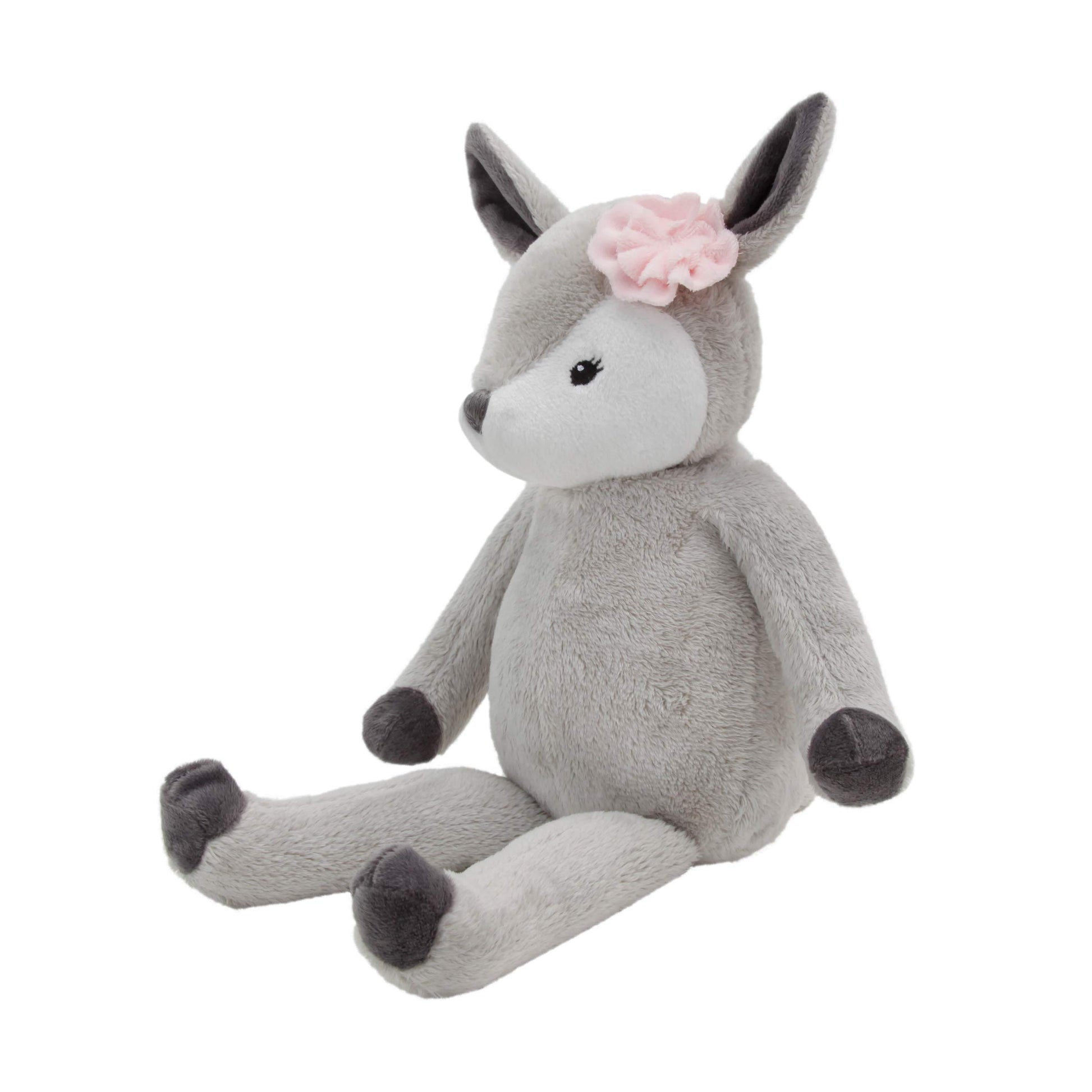 Little Love by NoJo - Lucy the Plush Deer. Lucy the plush deer is the perfect friend for someone sweet! She is made of so soft Velboa fabrics with an adorable smiling face, long eyelashes and pretty pink rose atop her head. She is featured in shades of soft grey, white with charcoal accents. This cute plush Deer character measures 14' x 6' the perfect size to snuggle with at bedtime, naptime, or take in your backpack for sleepovers. Recommended age is 36 months and up.