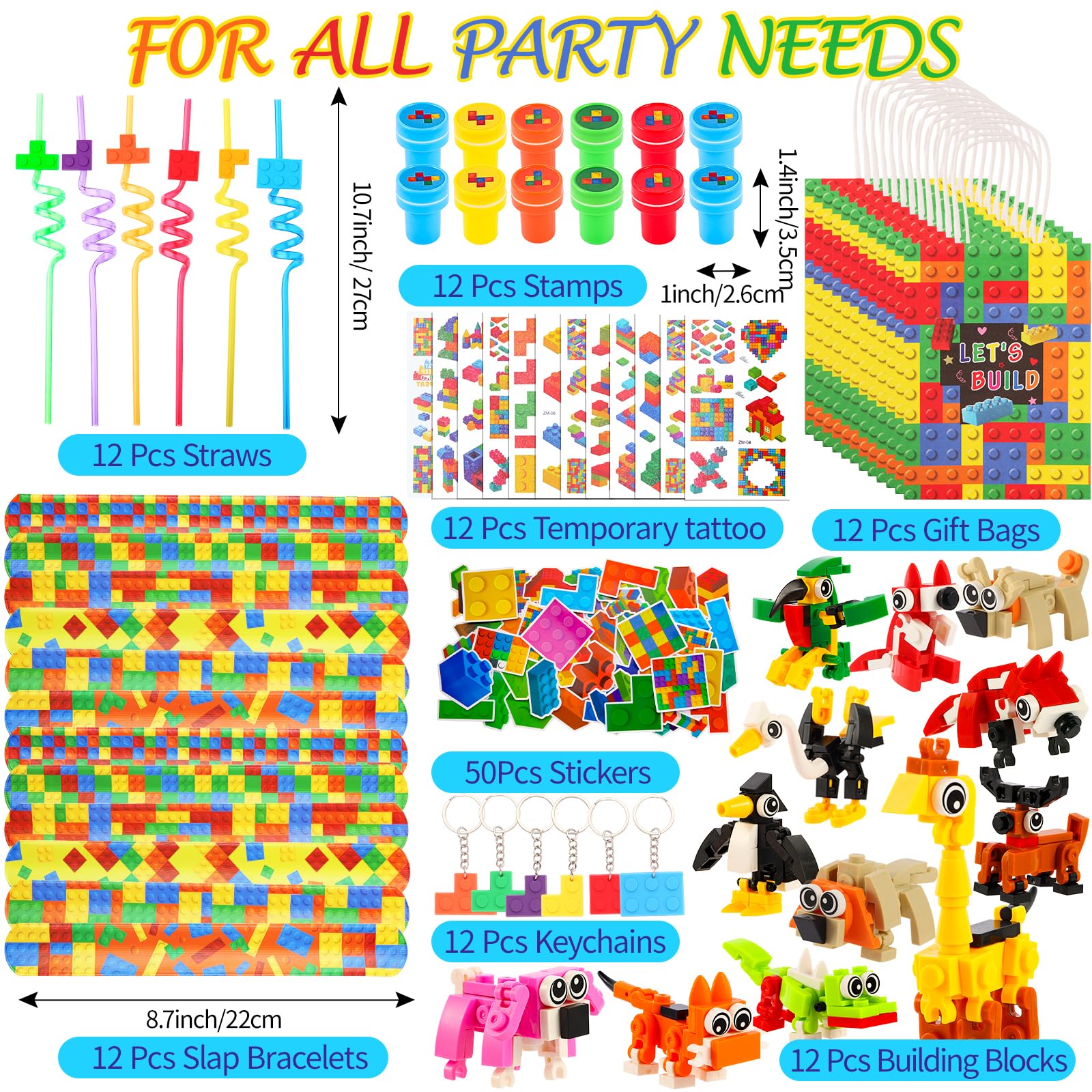 LiYiQ 134 Pcs Building Blocks Party Favors with Reusable Drinking Straws Animal Building Blocks Slap Bracelets Keychains Stamps