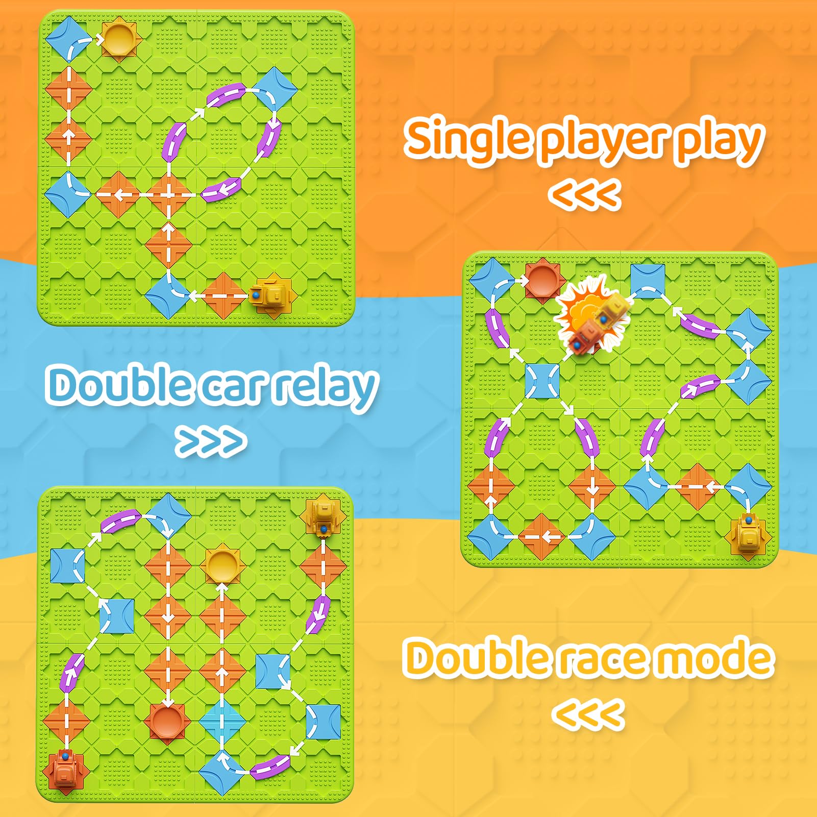 【Large Size Logical Road Puzzle Track Board Games】Compared with other logical road builder board games, it's larger size and has more play ways- 3 game modes (Single Player Mode, Two Cars Relay Mode, Two Players Competitive Mode) & 200+ challenges, Suits for Multiplayer family games. There are also small dots on the board which could add classic building blocks to make it fun 【Fun Pull-Back Cars without Batteries】Just set up start and end, Put together a path with puzzle pieces on the base board, wind up the cars and watch it smoothly transport the marbles to the end point. Logical road builder game with cooperation and Car relay race brings more joy than traditional single puzzle games, Your kids will have hours of fun solving puzzles and pushing the cars