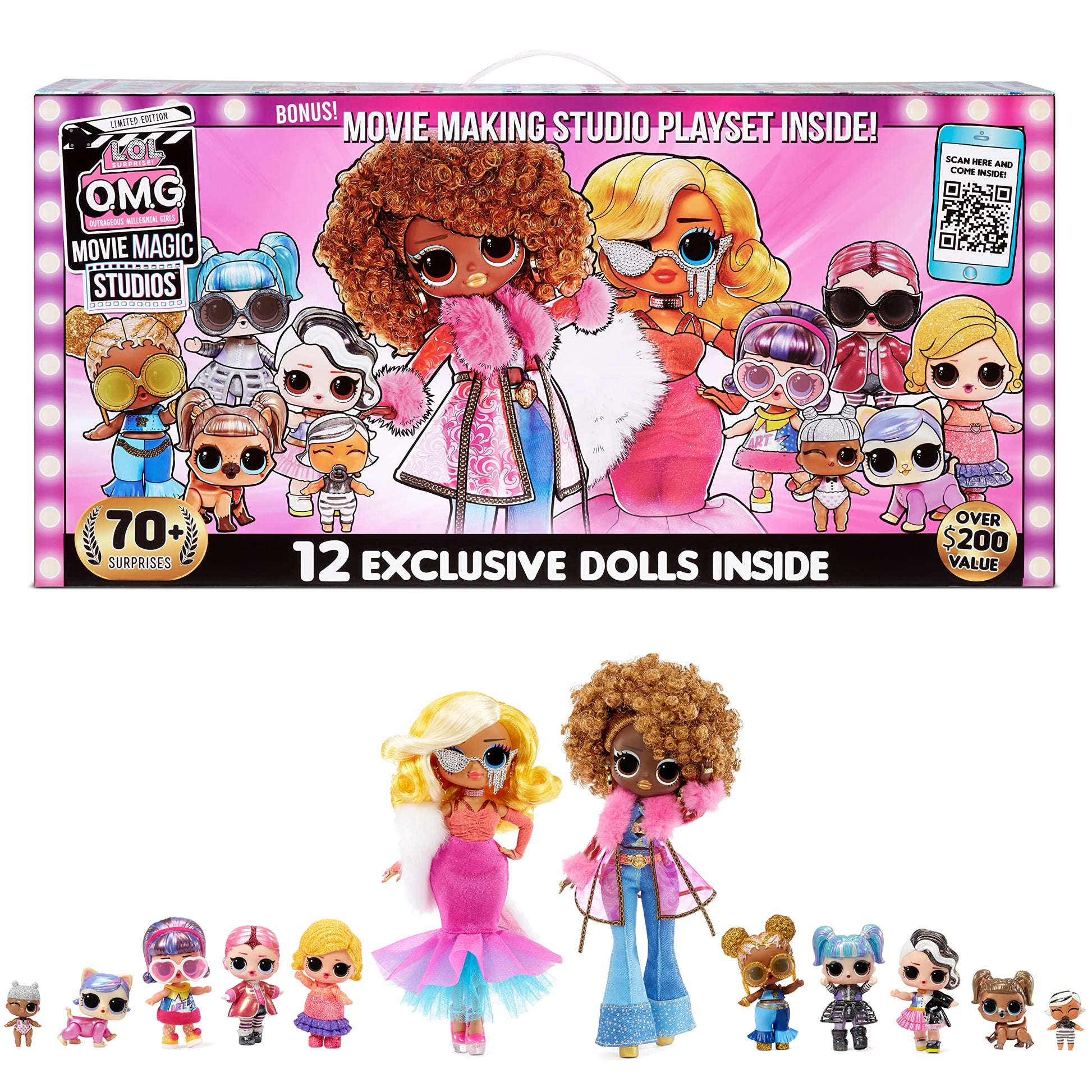 - Q: What does the LOL Surprise OMG Movie Magic Studios set include? A: This playset comes with 12 dolls, including 2 OMG fashion dolls, 6 LOL Surprise dolls, 2 pets, and 2 lil sisters, along with over 70 surprises and accessories to create a complete movie experience.