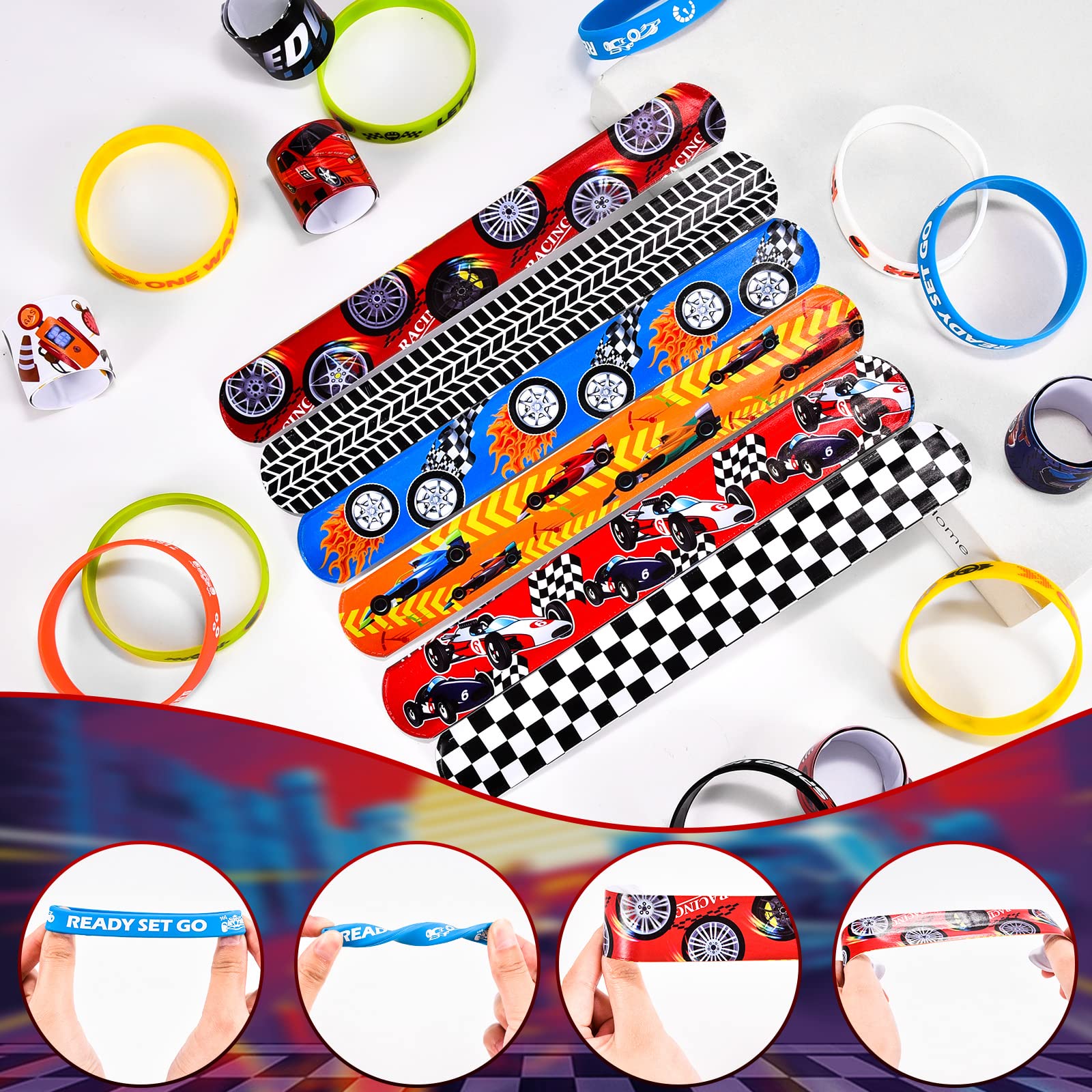?48 PCS Bracelets?This race cars party favors jewelry includes 24 pcs slap bracelets (12 different styles) and 24 pcs silicone wristbands (6 different styles). Providing your kids of car lovers with different styles to meet their daily matching | ?High Quality?Made of high quality material, which is durable, fade-free, smell-free and safe for kids. Keeping your lovely girl