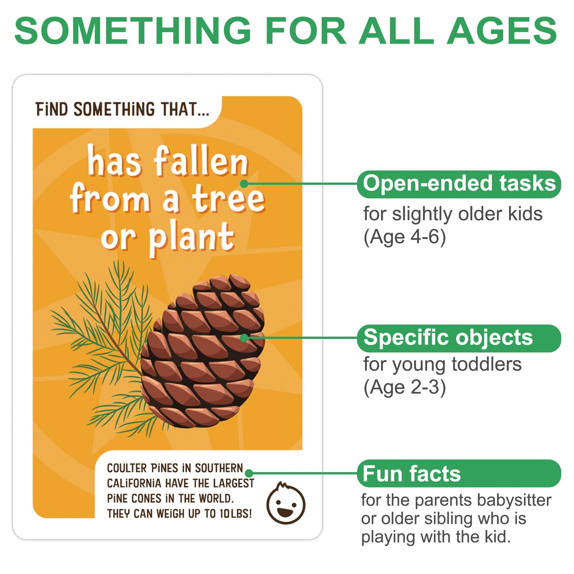 Hours of Fun for Kids and Adults Our Educational card games set includes fun decks of indoor and outdoor scavenger hunt, Family trivia, and Mnemonic alphabet flash cards. Great family entertainment for all ages stuck inside or during road trips. Q&A: Are these cards made of plastic or paper? They are made from cardstock with blue core construction, and laminated with plastic film. What size are the cards? They are jumbo size cards, measuring 4.75” x 3.15”. Perfect size for kids and easy to read. How thick are the cards? The cards are made from 280 GSM paper and laminated for extra protection. Will the trivia cards work for a small or large family? For what ages of kids would this be appropriate? The set works for families of any size. We play-tested with a family with kids ages 3, 5, 7, 10 and 13 and they had a blast! What are the rules for this trivia game? The game is meant to be played as an engaging family activity with no “winner” or “loser”. However, if you would like to keep score, there is a point scoring system provided in the instruction card. How many cards are in each deck? 26 Laminated Alphabet Cards 45: 44 indoor Scavenger Hunt cards and 1 instruction card 45: 44 outdoor Scavenger Hunt cards and 1 instruction card 60: 59 Family Trivia cards and 1 instruction card