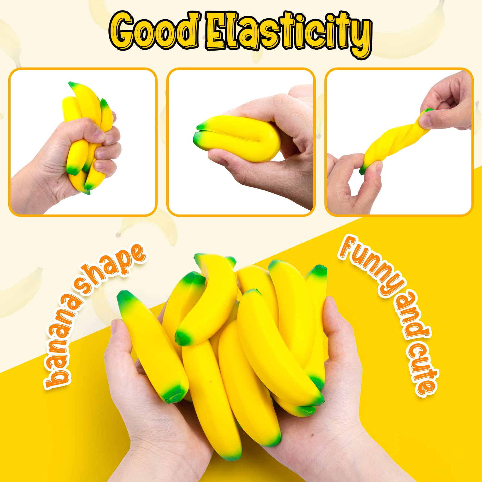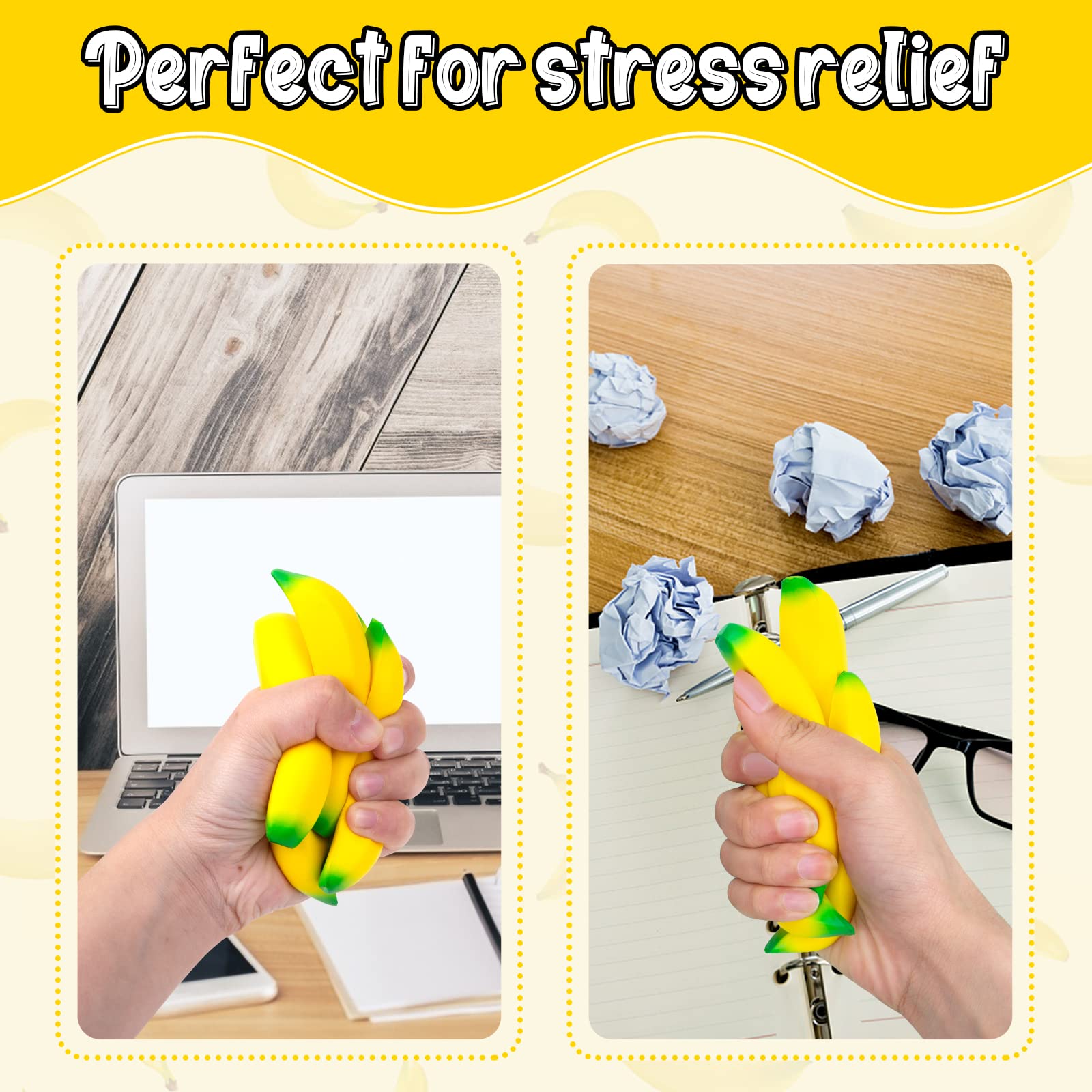 - Q: How can I use these banana squeeze toys for stress relief? A: You can squeeze the banana stress toys in your hands to relieve stress. They easily snap back to their original shape, providing a satisfying sensory experience.
