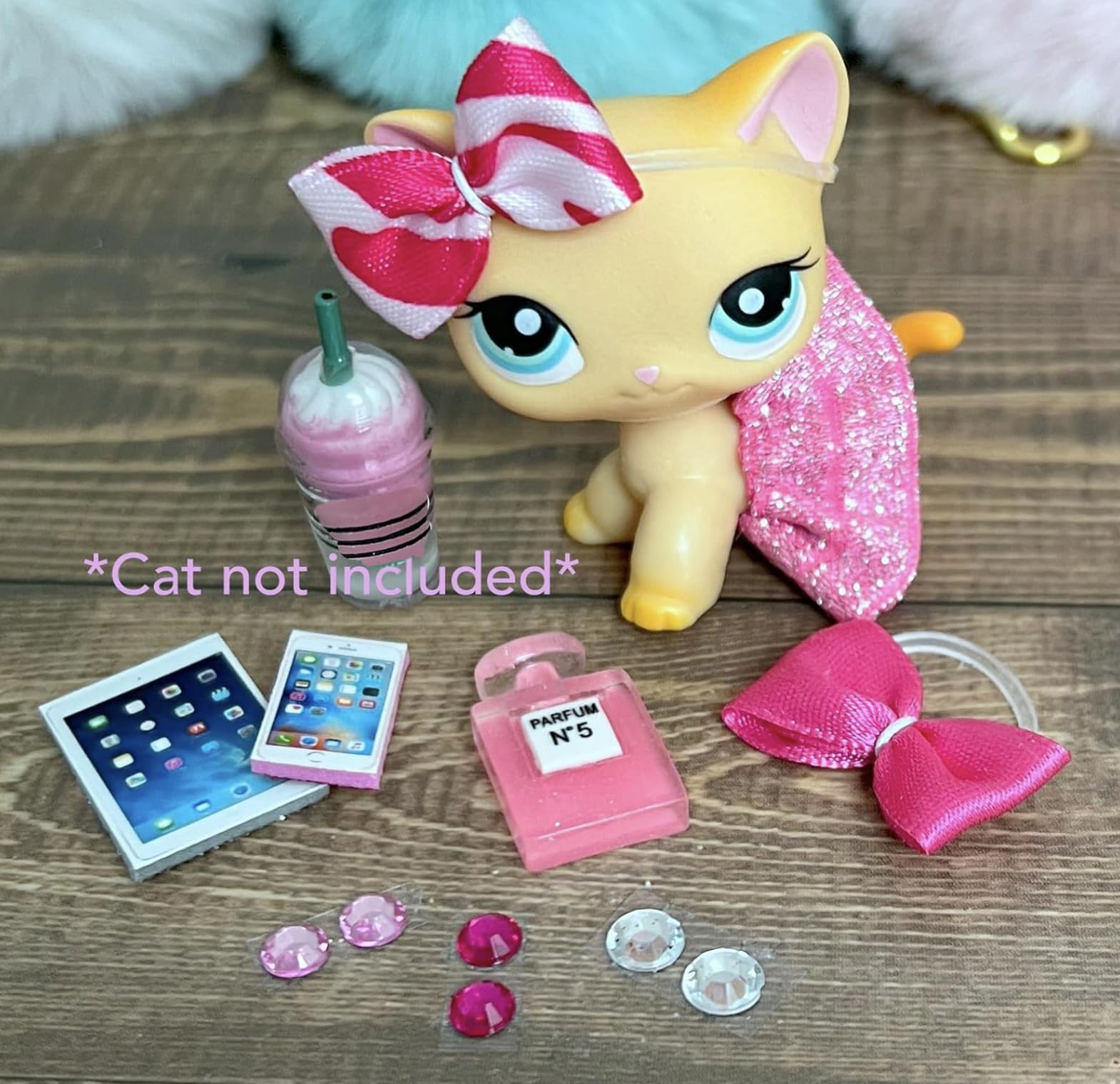 Pet Shop 10 PC Accessories Lot. Includes 2 Skirts , 1 Bow, Frappuccino Cup, Perfume Bottle, Sparkly Phone, Sparkly Tablet & 3 Pair Stick on Earrings. *CAT in Picture NOT included* Adorably wrapped and makes a great gift for your littlest pet shop lover.