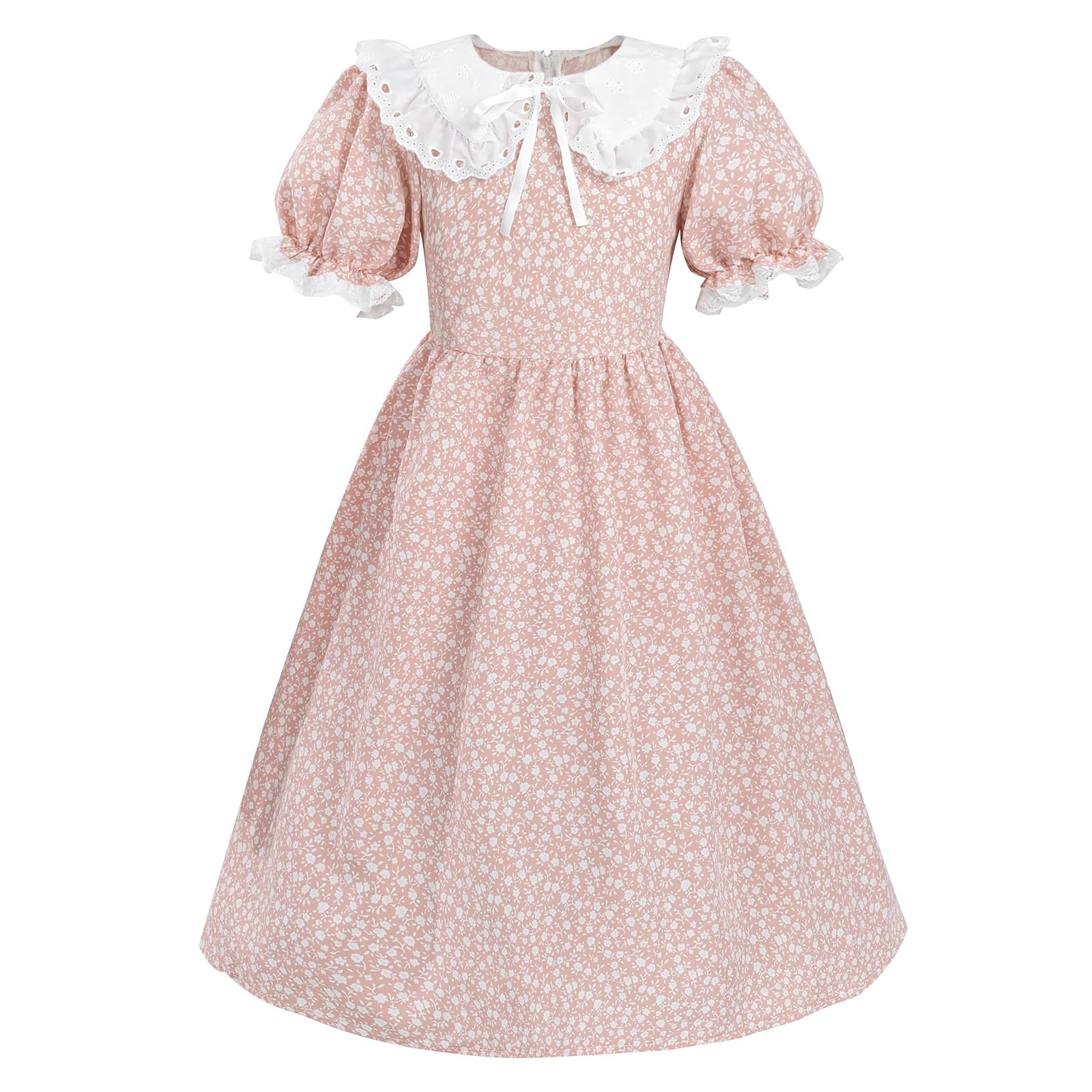 LTAKK Pioneer Dress Girls Colonial Costume Prairie Pilgrim Girl Dresses with Ruffled Pinafore, Peach, Small, age over 4 years ol