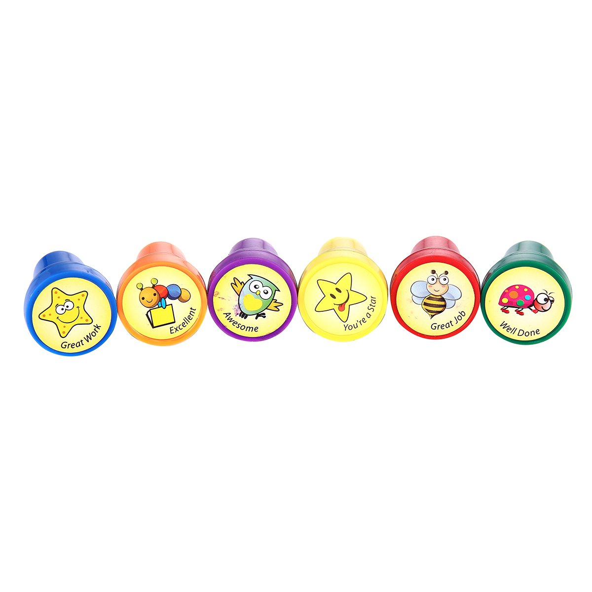 Size: 1-1/2', Nice Size For Kids To Hold. | 6Pcs Per Unit, With Assorted Ink Colors, Each One Is Different. | Self Inking Easy To Use And Fun For Everyone. | Made Of Plastic Stamper, No Need To Press Hard To Make An Impression. | Great For Goody Bags Or Craft Boxes. If You Happened To Receive The Stamp Set With Some Of The Stamps Dried Out Or Does Not Work Correctly, This May Be Caused By The Stamps Drying Out In The Inventory Or Shipping Process, You Can Just Add Some Drops Of Clear Water To This Dried Stamp, And Wait For A Moment, Then Try To Stamp It Again, You Will See The Clear Print. You Can Also Reported To Us Any Issue By An Email.