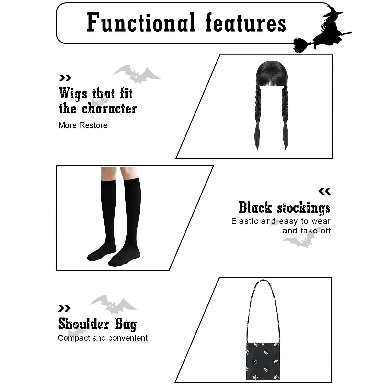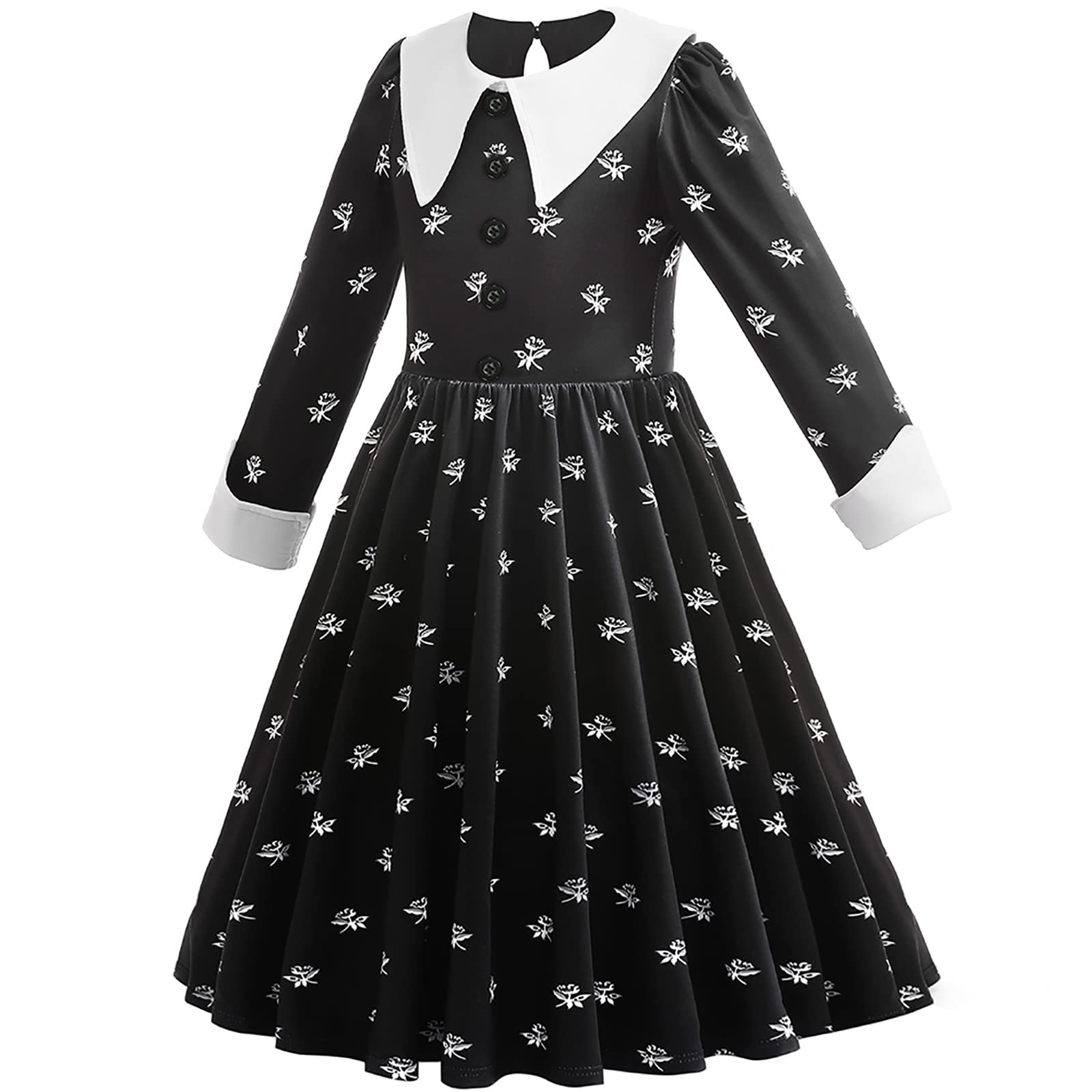 Design: Girls Halloween Costume Dress Design Inspiration Comes From Characters In Popular Tv Series. | Dress Details: This Black Costume Dress Make Of Elastic High-Quality Polyester Fabric, Exquisite Flower Pattern, Collar And Cuffs Are Made Of Pure Cotton. Exquisite Buttons Are Sewn On The Front Of The Dress. | Occasion: The Kids Cospaly Dress Is Perfect For Daily Wear, Halloween Costume Cosplay, Christmas, Carnival Role Play, Themed Parties. It Is Also An Excellent Birthday Gift For Your Girls. | Package Included:1*Dress, 1*Wig, 1*Bag, 1*A Pair Of Earrings, A Pair Of Socks. 2023 New Costume Dress. | Size: 6 Sizes Suitable For 4-12 Years Girls. Please Check The Size Carefully Before Purchasing.