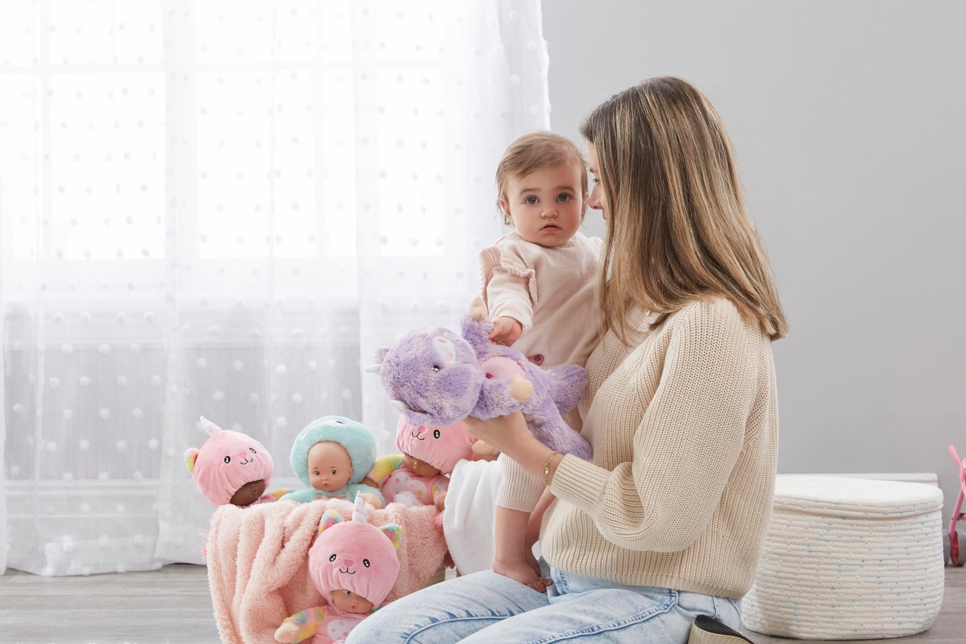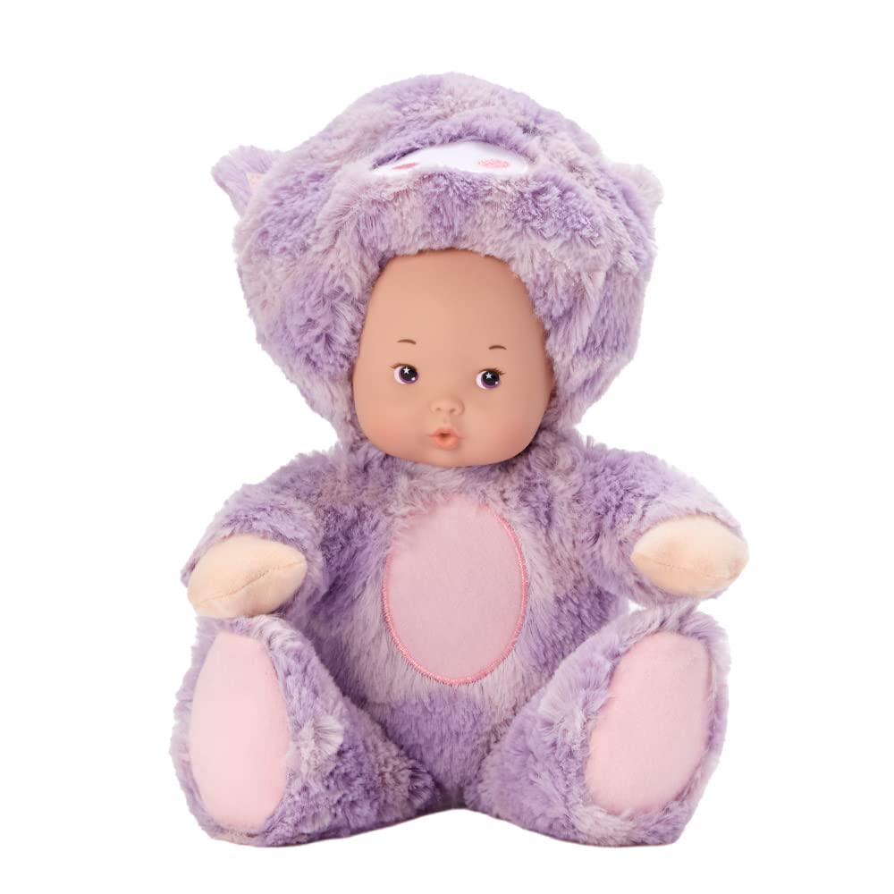 Peek-a boo hood and soft body helps develop motor skills. Play peek-a-boo with this sweet, snuggly baby in plush! Soft fabric body and soft vinyl head are perfect for little hands to grasp. Lavender plush Highland Cow outfit with peek-a-boo hood and soft heart applique on belly. Light skin tone, painted blue eyes, sweet expression! Easy to clean and crafted of baby-safe materials. Quality craftsmanship that demonstrates 'love is in the details.' Washable, measures 12' tall. Recommended for ages Newborn and up. Perfect for newborns and toddlers, satisfies their need to nurture. Peek-a boo hood and soft body helps develop motor skills.