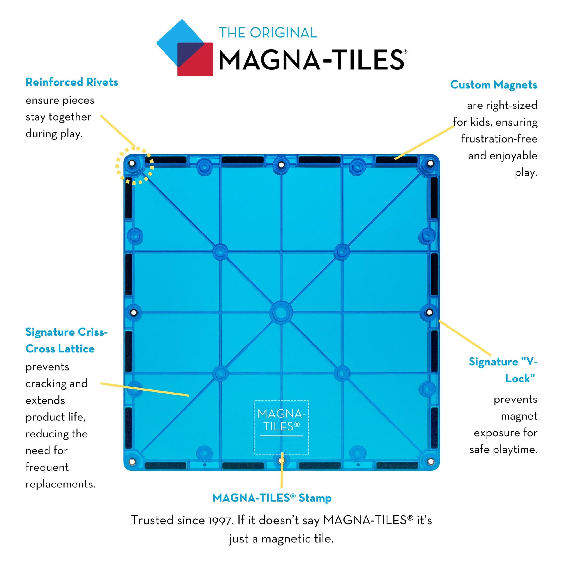 - Magna-Tiles easily connect for hours of open-ended play.
