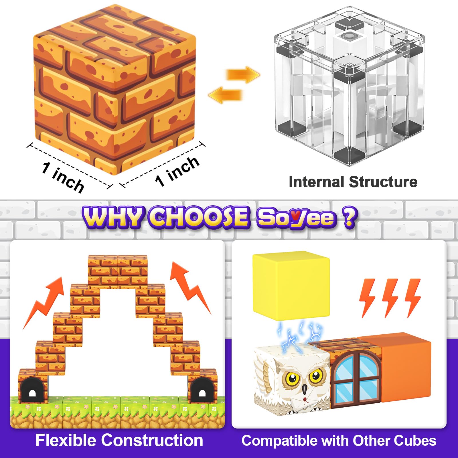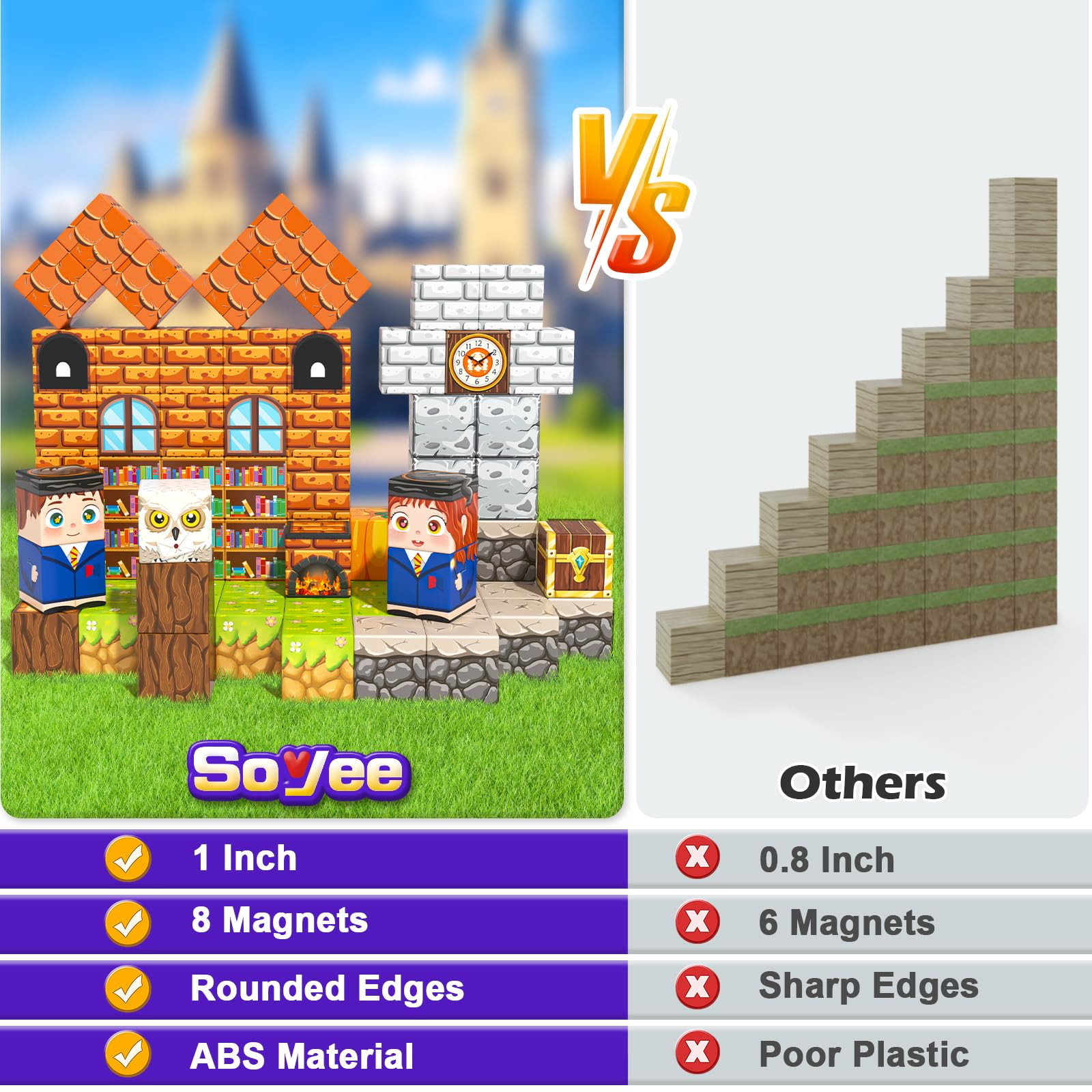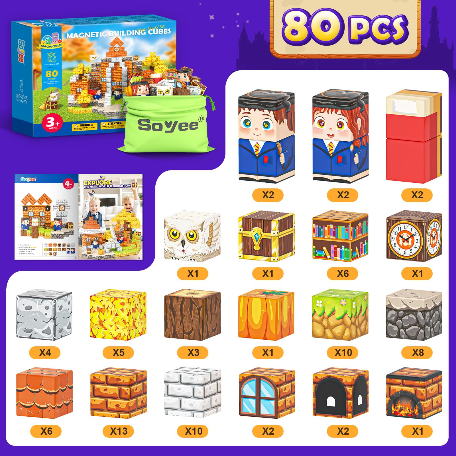 Step into a world of magic with the SOYEE Magical World Adventure Set! This 80-piece magnetic block set lets kids build castles, uncover treasure chests, fly on magic broomsticks, and explore a grand wizarding library. Featuring golden maple trees, cozy beds, and secret passageways, it sparks endless creativity. Made with 1-inch magnetic cubes and UV-printed details, it ensures compatibility, durability, and safety. A perfect STEM learning toy to enhance spatial skills, problem-solving, and imagination, making it an ideal gift for young wizards and builders!