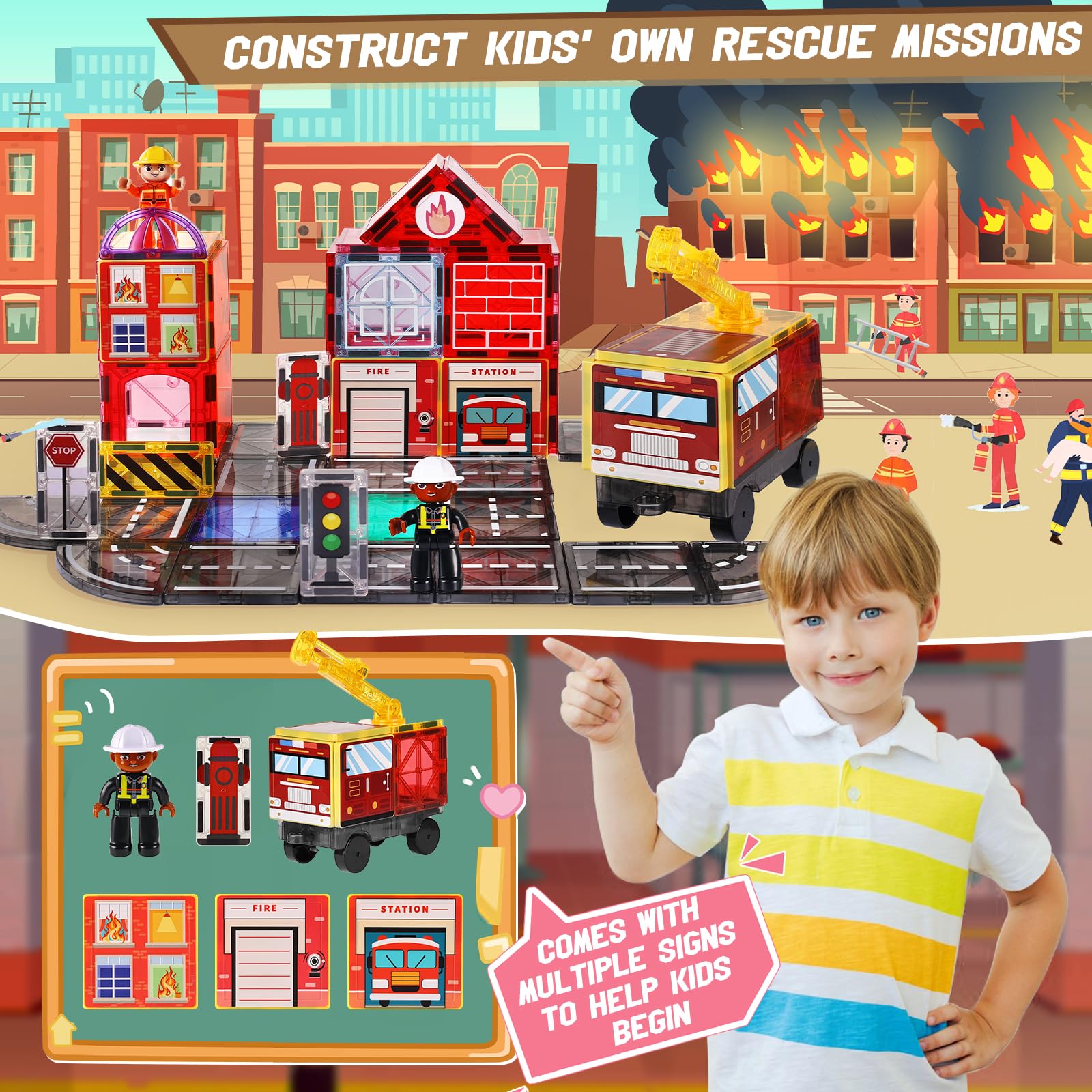 Spark kids imaginations with the Lotmey City Road Fire Truck Toys & Construction Toys playset for kids age 3+ years old. The 48 pcs magnetic tiles set feature double-sided themed patterns: firefighting scenes and construction site scenes. Children can experience the thrilling game of fire rescue and also create their own cool crane stories.This set includes a fire station, a firefighter, a fire truck, a fire hydrant, an engineer, two cranes, construction signs, safety signs, no entry signs, roads, traffic lights.Kids can also get an engineering station and construction vehicles for hours of role-playing games. ?Firefighting Scene Play? A boy in a yellow outfit is at work, suddenly someone shouts Fire! Oh no! A house is on fire with black smoke!The boy quickly calls 911.The alarm at the fire station sounds,firefighter jump onto the fire truck, race on the magnetic road to save the world.This brave fire truck is here for the rescue!Firefighter open the fire hydrant,spray water to extinguish fire, extend the ladder to save people from the roof.It's an exciting and stimulating rescue game! ?Construction Scene Play? The bustling construction site is building a new building.Engineer drives the engineering vehicle, pass through the city roads,go through traffic lights, arrive at the site.He set up construction signs and safety signs.A crane on top of the building, lifting bricks, placing them, and building walls.Engineer operates the crane truck, extends the arm, rotates, and works with the crane to build houses one by one.How cool! An imaginative construction game full of creativity! Kids learn about the world around them through stories and scenarios that depict real life in a fun and exciting way.