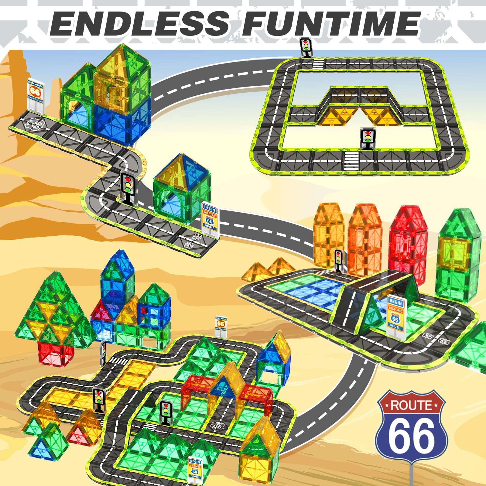 Magnetic Tiles Route 66 Road Set,Magnet Building Blocks For Kids Toys, Creative Construction Toys For Boys & Girls Ages 3-5 4-8
