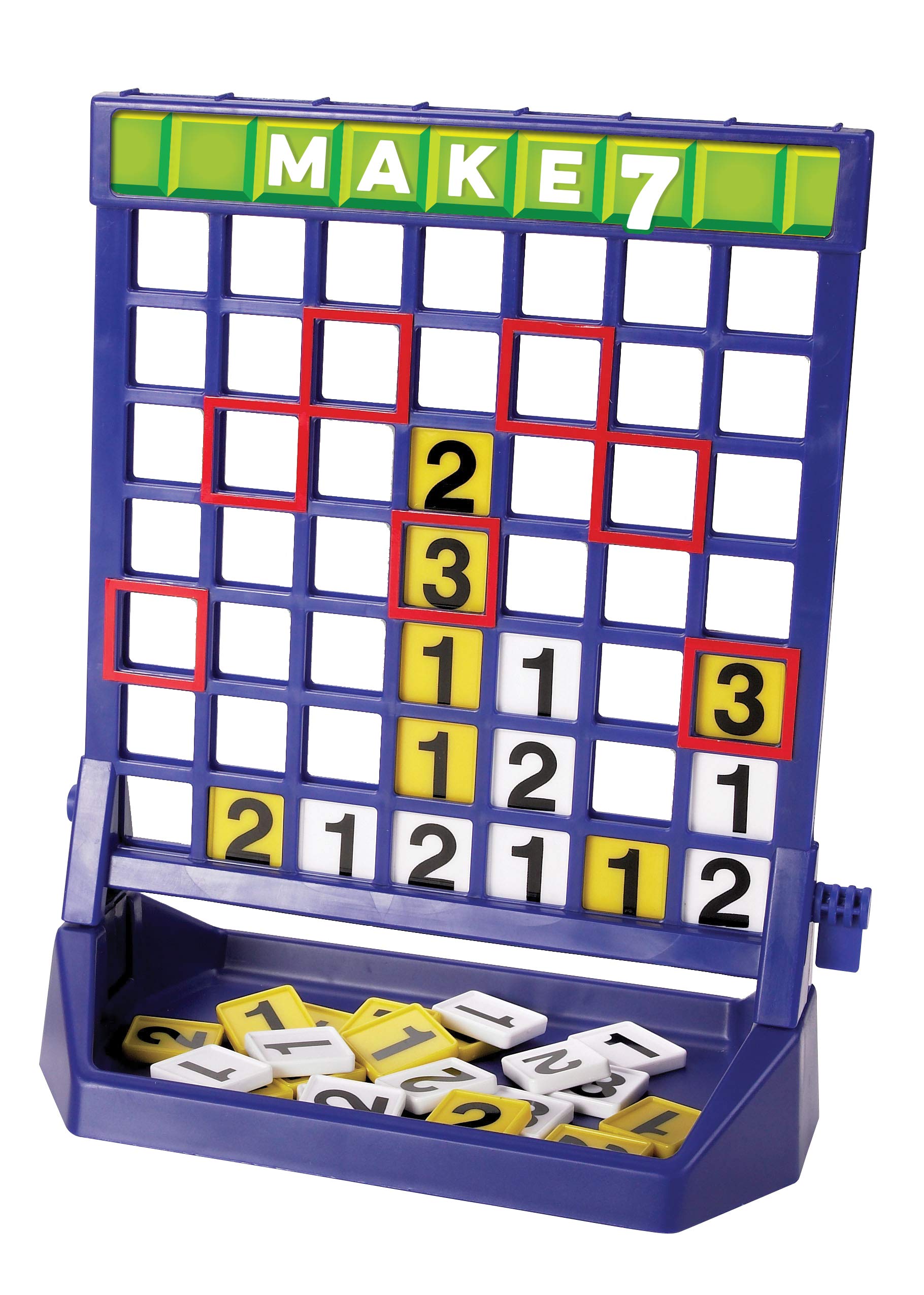 Challenge your friend and your mind with Make 7, the STEM game with an exciting twist that always adds up to fun! Players take turns dropping one tile down into any slot on the console. Just remember one simple rule - a 3 can only be placed so it lands on a RED square. The first player to get their color tiles to add up to 7 in any direction wins! Easy release knob on the side of the console quickly releases the tiles, so youre ready to play again! Can you Make 7? For 2 players, ages 7 and up.