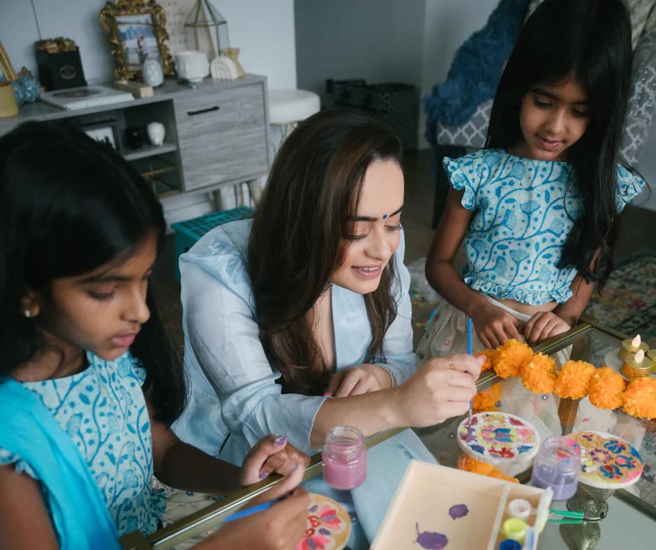 The kit includes 4 Rangoli design engraved coasters, paints, and 2 paint brushe | Paint the coasters and display them for long lasting celebrations | Learn about traditional Indian and South Asian patterns while painting the Rangoli designs | The designs are perfect for all ages, even adults | A great classroom, Holi party and family activity.
