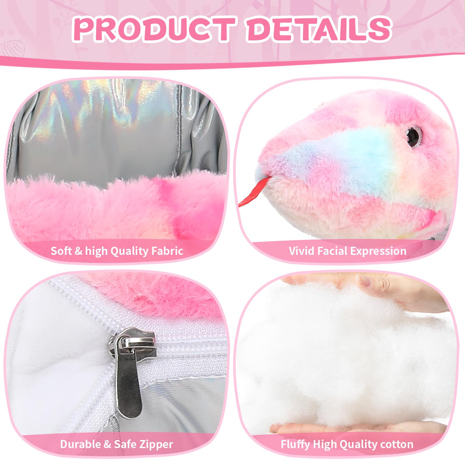 - Q: How do I clean the giant snake stuffed animal? A: The snake plush toy is washable. It is recommended to hand wash or use a gentle mode in the washing machine. After washing, you can reshape it by organizing the stuffing and gently patting it.