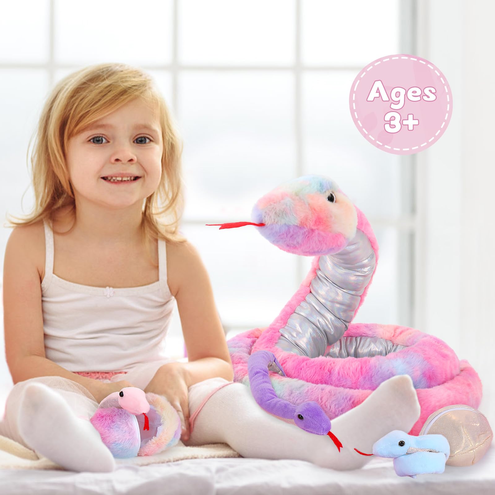 - Q: What is included in the MaoGoLan Giant Snake Stuffed Animal set? A: The set includes a large mommy snake, three mini baby snakes in purple, blue, and pink, and three snake eggs in white, rainbow, and silver.