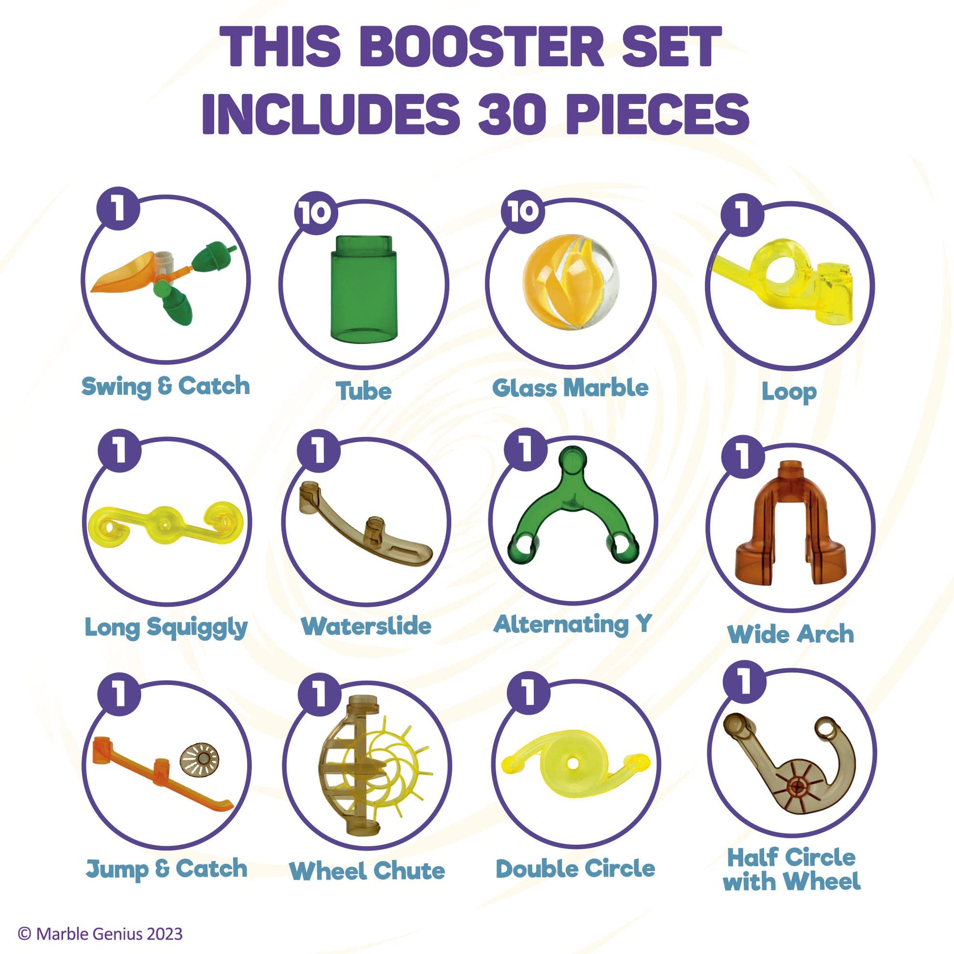 - Q: How many pieces are included in the Marble Genius Marble Run Booster Set? A: The set includes a total of 30 pieces, featuring 10 action pieces to enhance the building experience, including a wide arch for stability, see-through tubes, and various exciting components to create dynamic marble runs.
