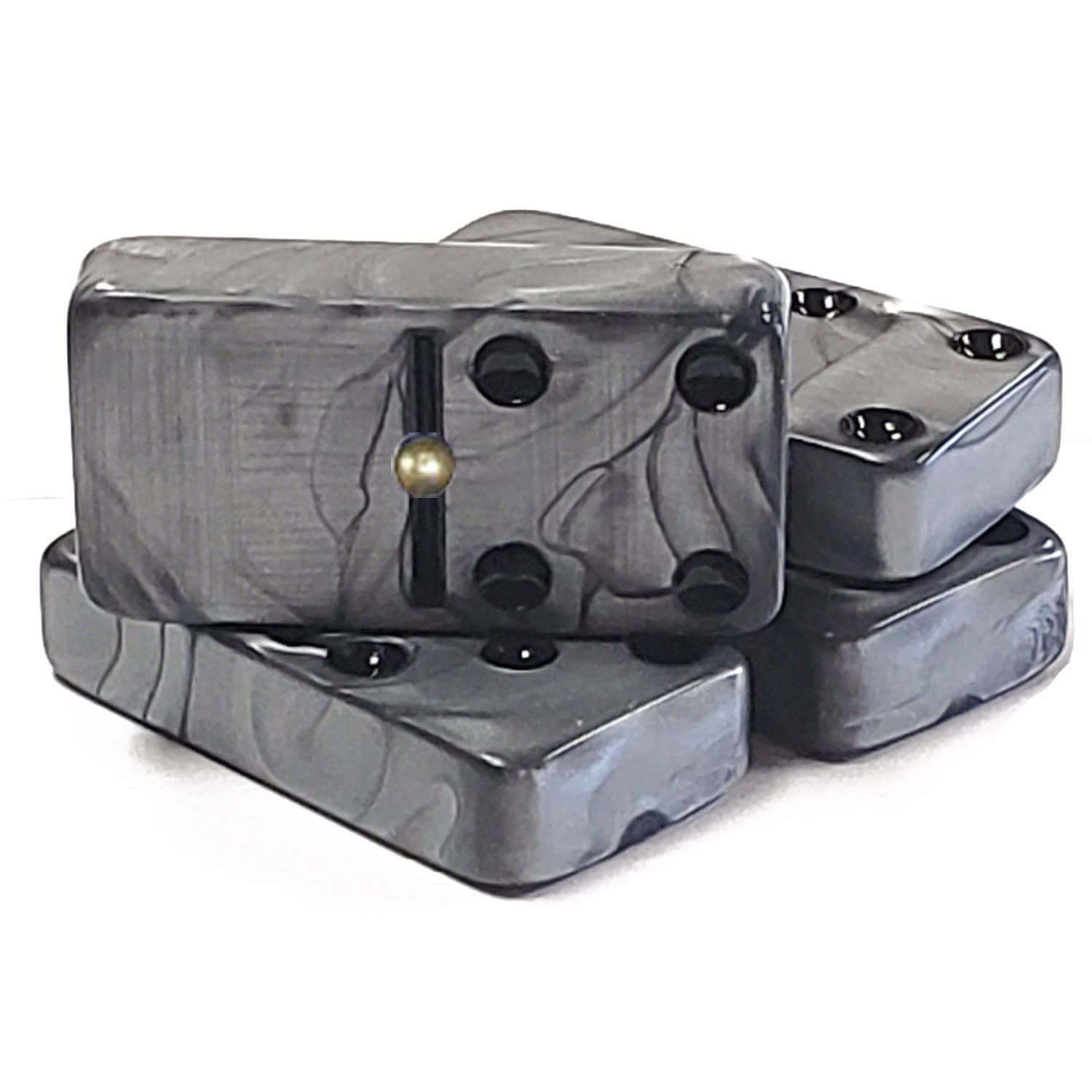 One Double Six Set of Dominoes (28 Tiles with Spinners) in Silver with Black spots. Tournament Jumbo Size (2'' X 1'' X 1/2''). (54 x 28 x 12mm) Comes in an Elegant Black Velvet Drawstring Bag