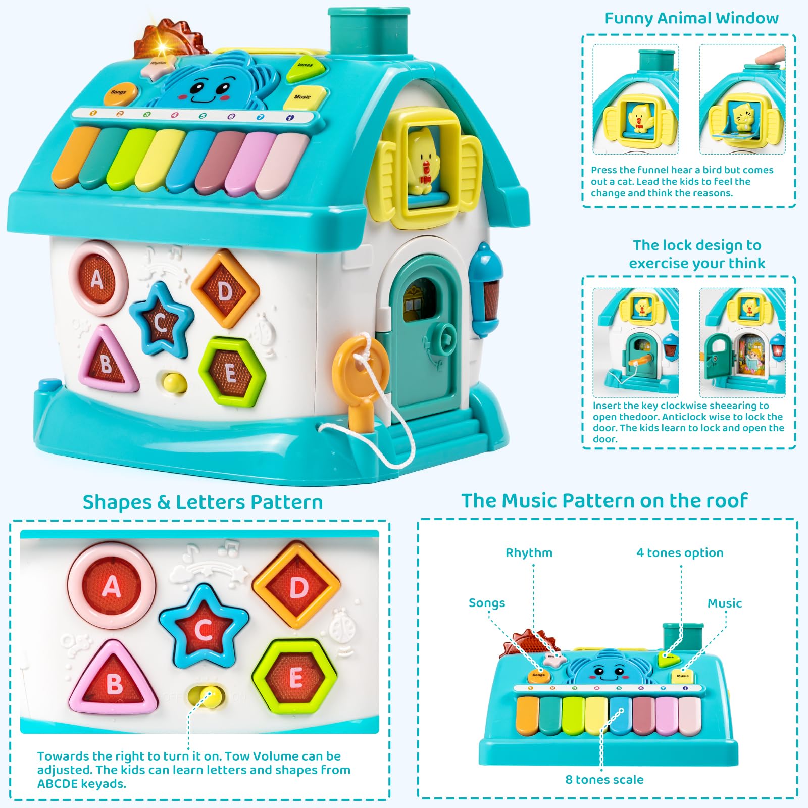 - Q: What features does the 8-in-1 multifunctional house toy include? A: This toy includes various engaging features such as a telephone, music zone with 8 keyboard keys, an adjustable clock, funny animal windows, a driving car, mathematics patterns, shape and letters patterns, and an unlocking design.