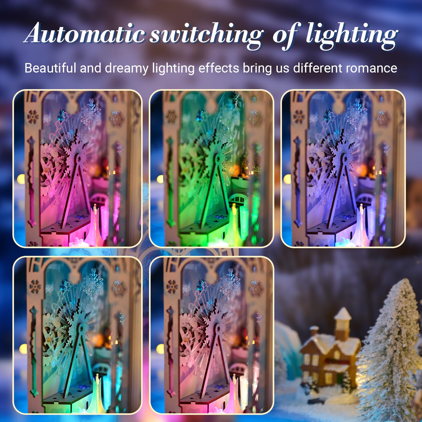 • Q: How does the automatic lighting feature work? A: The kit includes built-in lights that automatically switch on, creating a magical ambiance. This feature enhances the winter wonderland theme, making your reading corner glow beautifully at night.