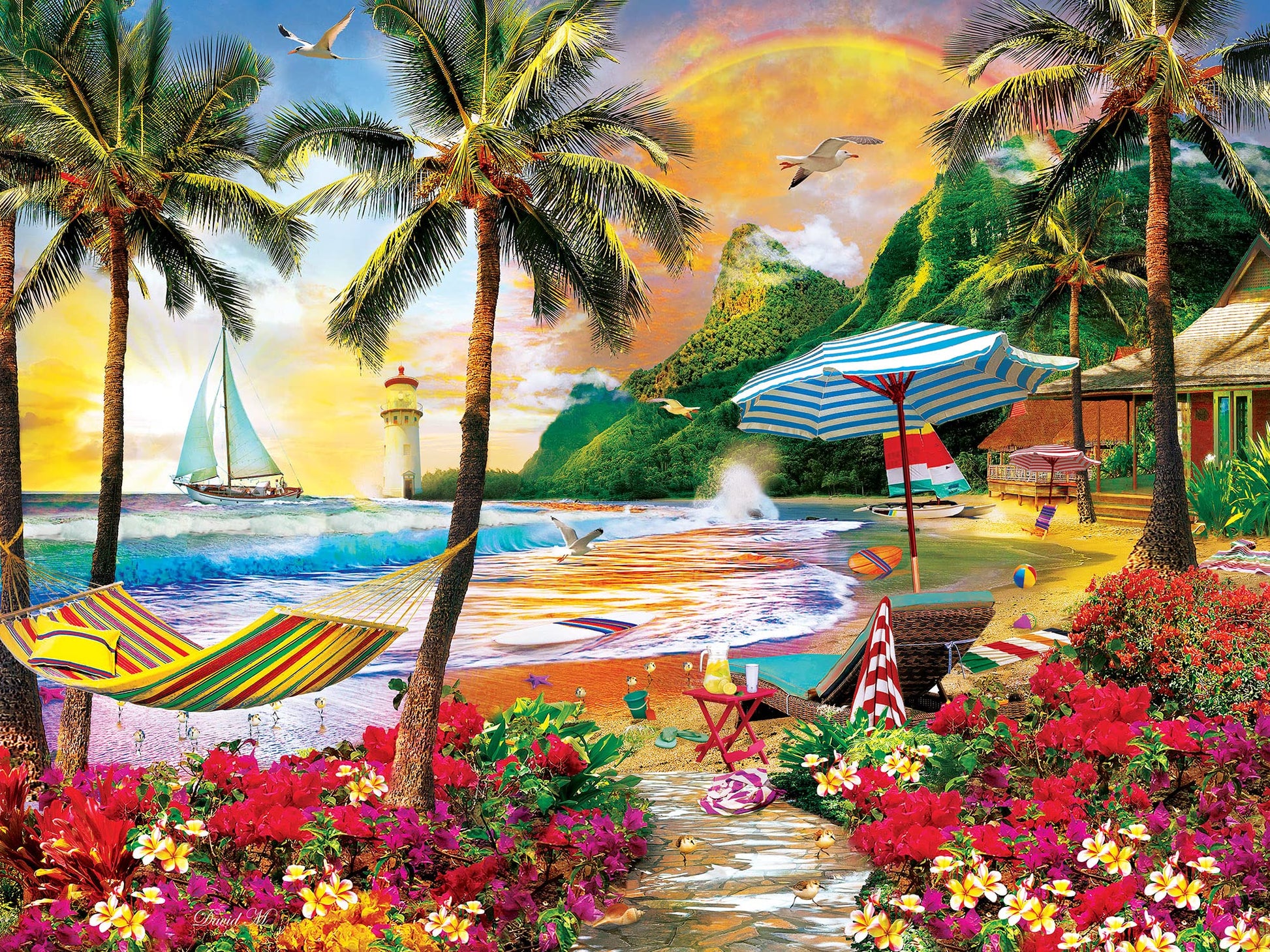 These MasterPieces 24'' x 18'' 550PC puzzle. Hawaiian get-a-way on the big island. To reduce their impact on our environment, the chipboard used in these puzzles is made of recycled material. For 25 years, MasterPieces has enjoyed making quality jigsaw puzzles, games, toys & Works of Ahhh craft kits. Innovation and premium quality is the MasterPieces hallmark. We pledge to always provide earth friendly products. Our puzzles are made from recycled paper and soy based inks. Green is not just a color, its a commitment.