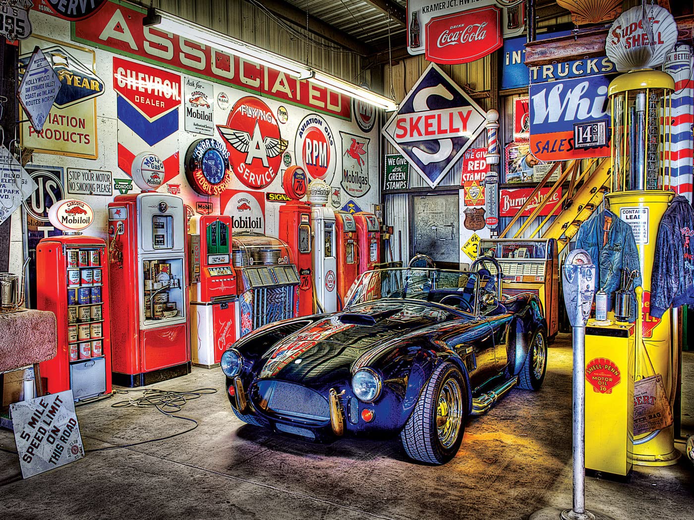 Classic convertible car in shop puzzle | 750 pieces in finished 18 inch x 24 inch puzzle | Read about artist Linda Berman & collect the series | Thick recycled puzzle board and random cut pieces ensure a tight interlocking fit and create a fun experience