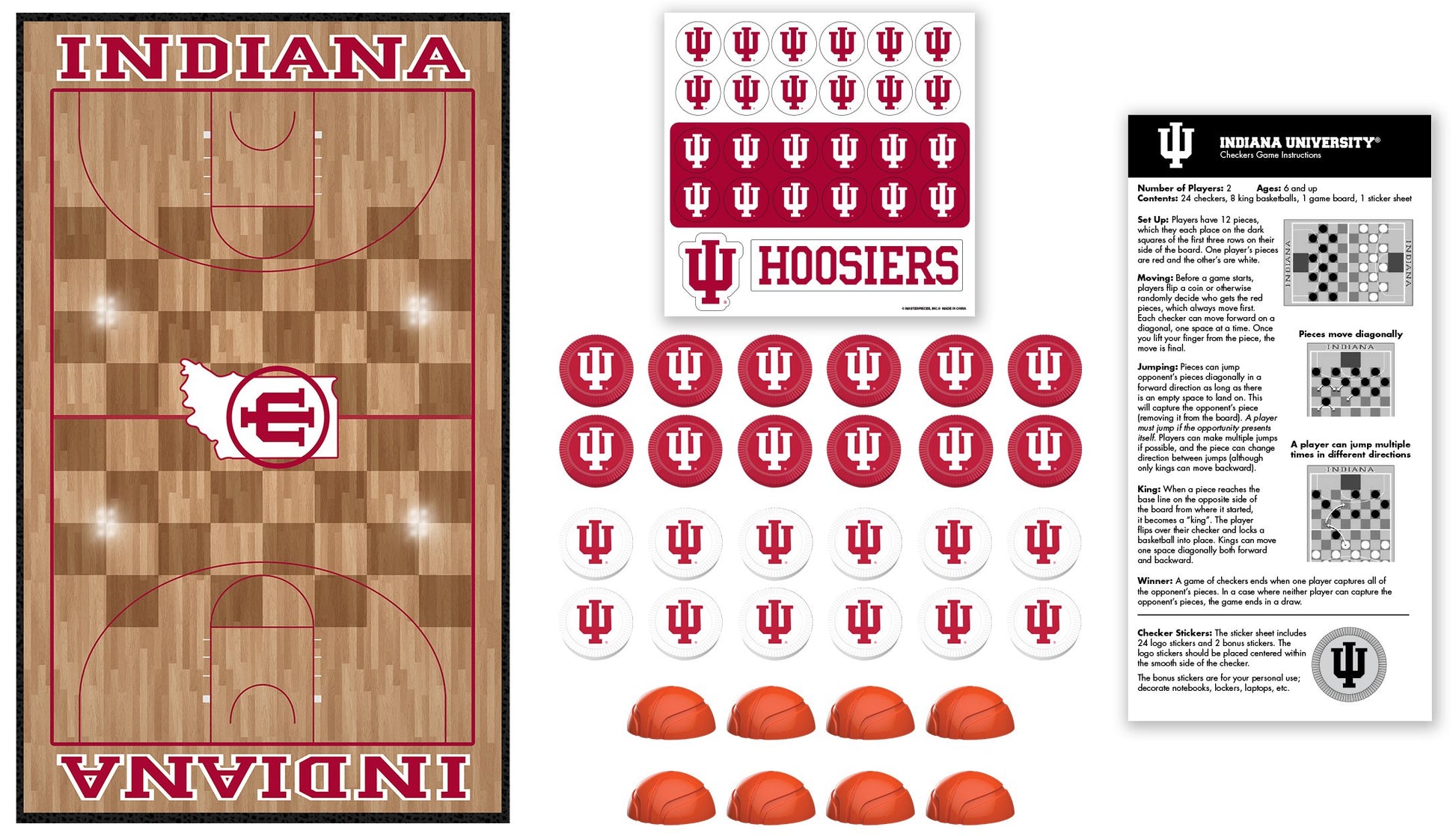 This MasterPieces Collegiate Indiana Basketball Checkers Game is the classic game of checkers where the king wears an Indiana basketball! The Indiana Basketball checkers game includes 24 Indiana Basketball checkers pieces, 8 Indiana basketball king pieces, a 13'' x 21.375'' Indiana Basketball game board, 1 sticker sheet, and an instruction sheet.