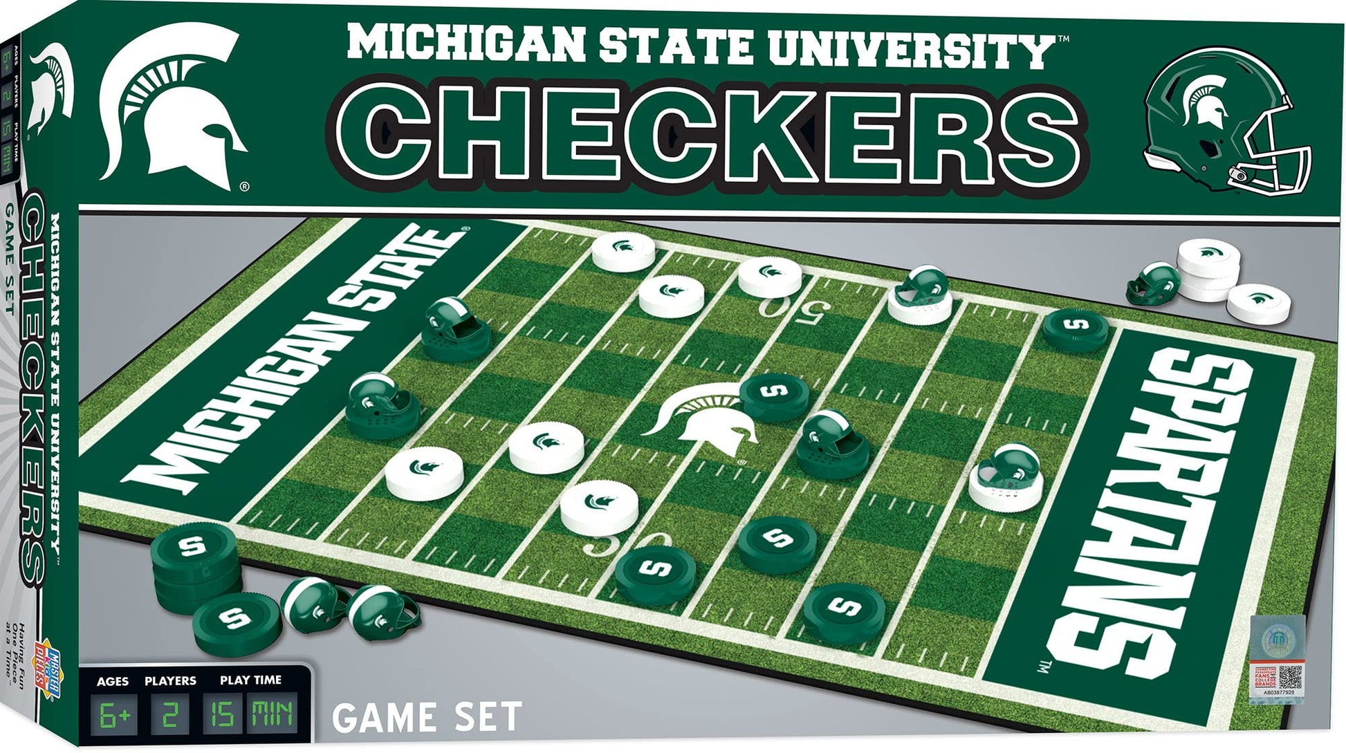 Officially Licensed Collegiate Product | Game includes 24 checkers pieces, 8 football helmet king pieces, 13 inch x 21 inch game board, sticker sheet and instruction sheet | Crown your king checker with a Michigan State helmet that snaps securely into place | Drive your checkers down the football field on a realistic checkerboard with team color end zones | MasterPieces - An American Puzzle & Game Company. We stand behind our products and guarantee your satisfaction