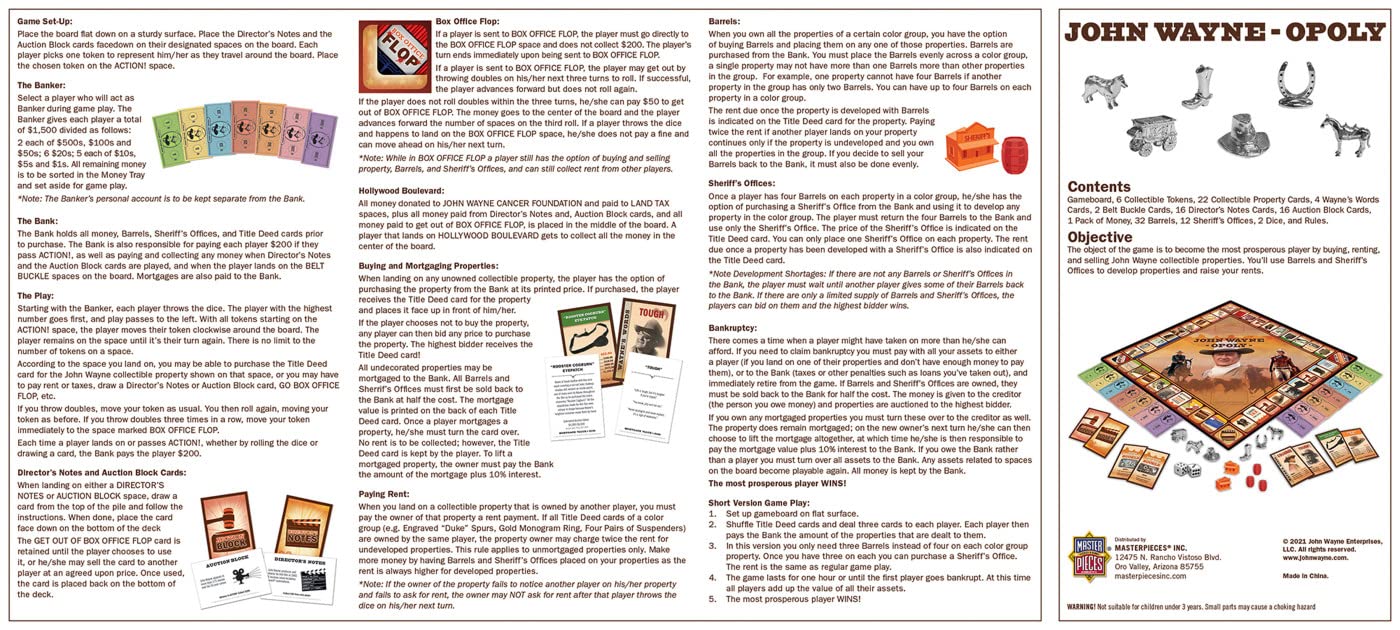 - Q: What materials are used in the John Wayne Opoly game? A: The game is primarily made from high-quality paper and includes custom collectible pewter tokens and plastic property markers, ensuring durability and a premium feel.