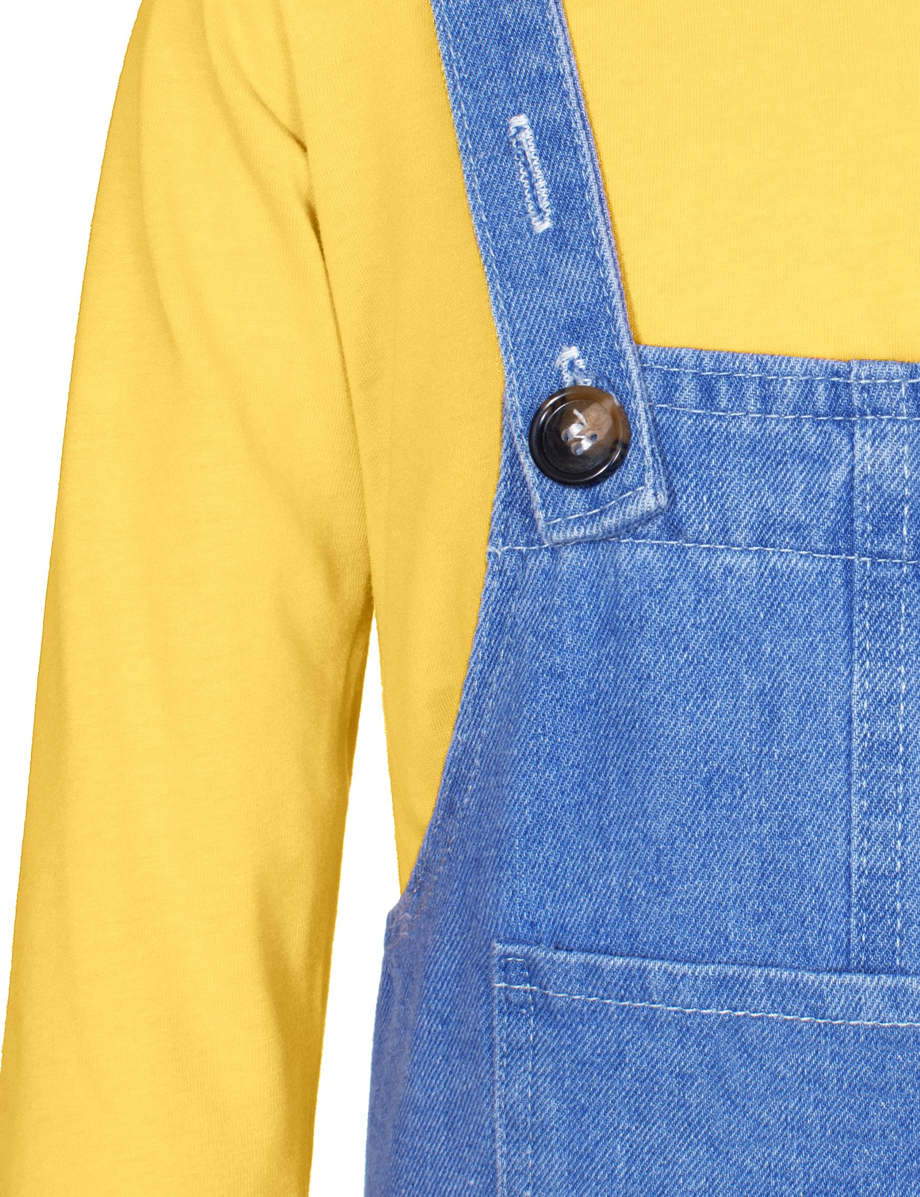 Package Include:Long sleeve Shirt,Denim overalls,Black Glove. | Design:Blue denim overalls, yellow tops, bring excitement to the children's performance. | Size:Suitable for most boys and girls, detailed sizes available in the picture. | Material:Overalls made with sturdy denim, shirts crafted from breathable, stretchy soft and comfortable fabric. | Occasion:Suit for movie and game role play, birthday, Halloween, Christmas costumes, dress up,role-playing, trick or treat costume, carnival, dance recital party,school show, and so on.