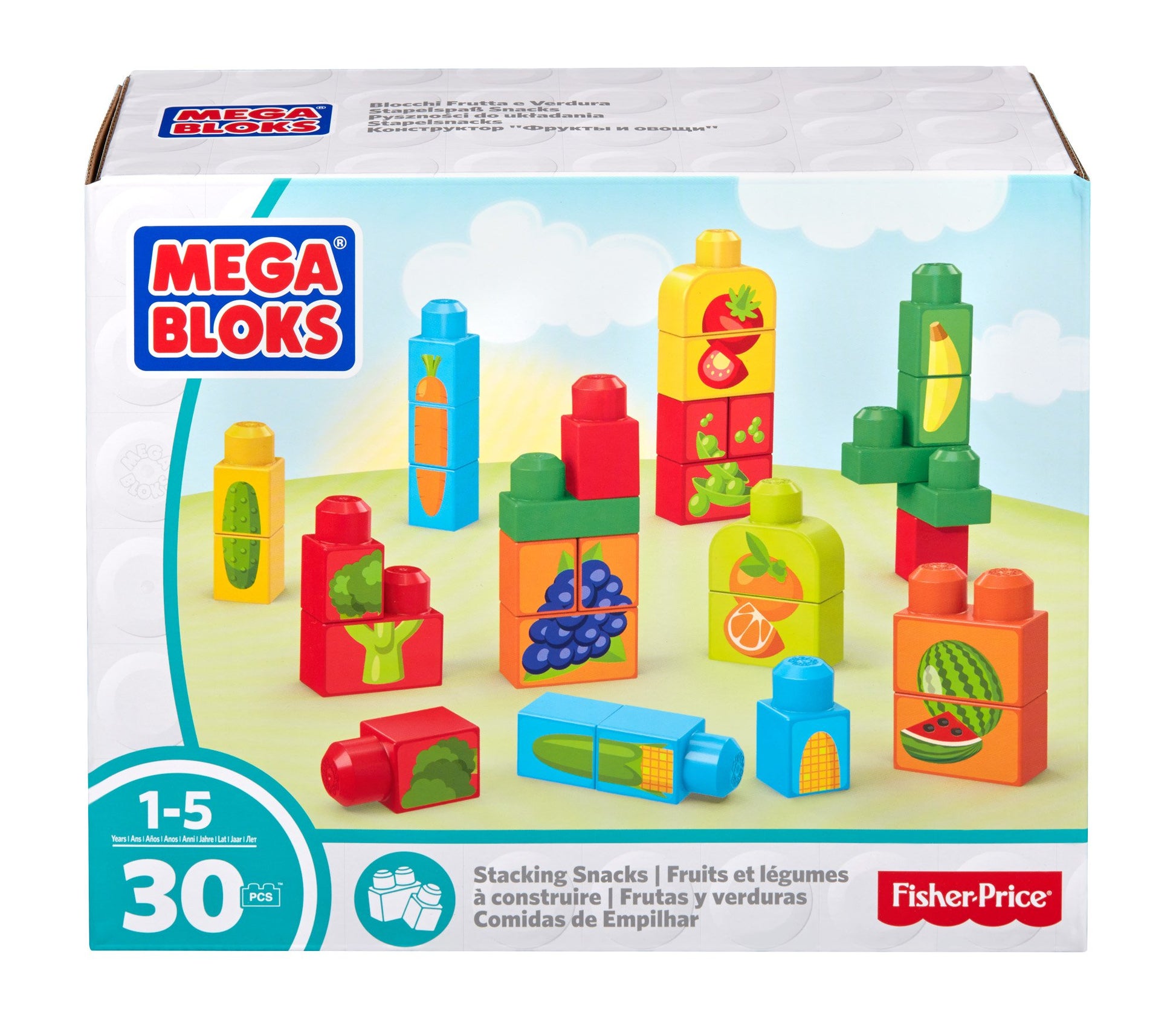 - Q: How many pieces are included in the Mega Bloks Stacking Snacks set? A: The Mega Bloks First Builders Stacking Snacks set includes 30 pieces, featuring blocks and special shapes to build various fruits and vegetables.