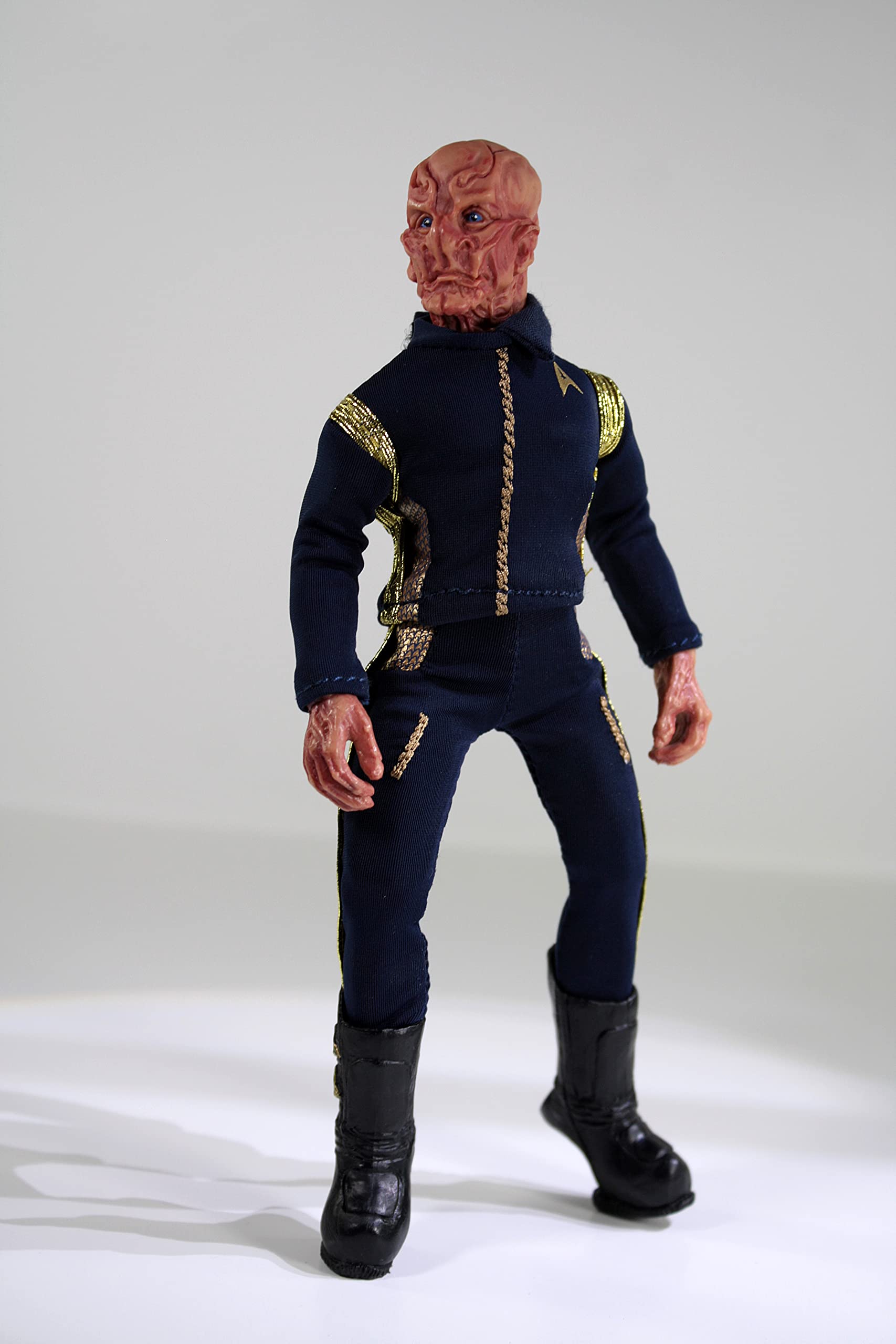 • Q: What materials are used in the Saru figure's construction? A: The Saru figure is made from high-quality materials including a detailed fabric Starfleet outfit and a cardboard packaging.
