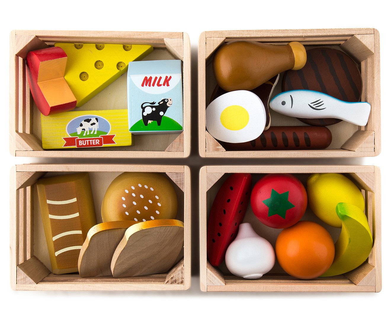 Product DescriptionFeed the imagination with this beautifully crafted wooden play food set! It includes 21 hand-painted solid wood pieces that can be mixed and matched to create a balanced 'meal.' The wide variety of items includes cheese, milk, watermelon, tomato, bread, fish, egg, steak, and much more! Four wooden crates (5.25 inches x 5.25 inches each) are included to sort the food into groups - dairy, produce (for fruits and vegetables), grains, and meat and fish. Kids can also sort by color or use the crates to combine foods to serve up pretend-play meals. This sturdy and colorful realistic wooden food set will satisfy kids hunger for hands-on play and can nourish cognitive development, too! It helps introduce the basics of nutrition, and can be used to teach early number skills, color recognition, sorting, and grouping. The smooth, solid wood pieces are sized for small hands to help promote fine motor skills and dexterity. The collection will spur creative play and encourage budding young chefs to explore healthy food for years to come.Brand StoryBy Melissa & DougFrom the ManufacturerFrom classic wooden toys to crafts, pretend play, and games, Melissa & Doug products provide a launch pad to ignite imagination and a sense of wonder in all children so they can discover themselves, their passions, and their purpose.Since the companys founding more than 25 years ago, Melissa & Doug has consistently delivered innovative products that inspire open-ended thinking, encourage kids to see new possibilities, and offer Countless Ways to Play. Its part of a bigger vision to Take Back Childhood. Because by giving children a true childhood with the space and freedom to explore their world, we give them a path to realizing their full potential!