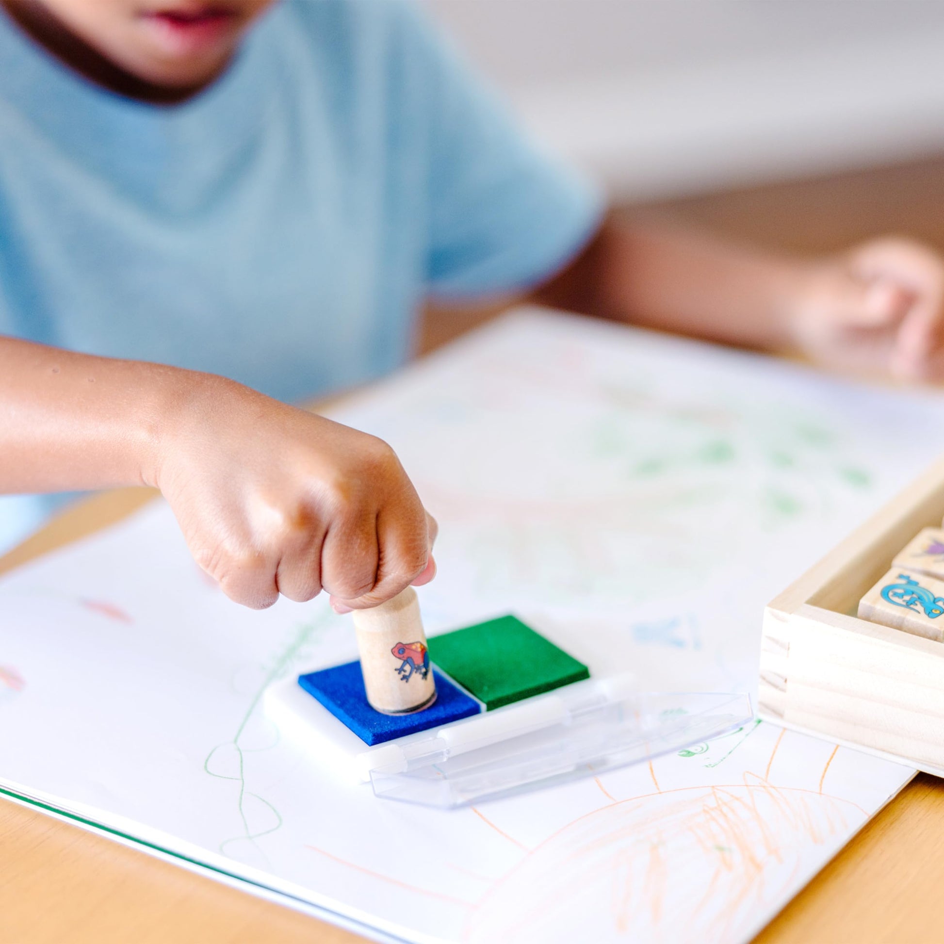 Product DescriptionMonkeys, snakes, birds and bugs galore combine to create a jungle straight out of your imagination! This extra-large stamp set for kids makes it easy to create an exciting storyline or a color-in scene: It includes 20 rubber-faced, wooden-handled outline stamps and a two-color stamp pad filled with blue and green washable ink. Five colored pencils coordinate with the jungle theme to add details and color in the scene. It's a complete arts & crafts activity and storytelling kit in one! For more than 30 years, Melissa & Doug has created beautifully-designed imagination- and creativity-sparking products that NBC News called “the gold standard in early childhood play.” We design every toy to the highest-quality standards, and to nurture minds and hearts. If your child is not inspired, give us a call and we'll make it right. Our phone number is on every product!Brand StoryByFrom the ManufacturerFrom classic wooden toys to crafts, pretend play, and games, Melissa & Doug products provide a launch pad to ignite imagination and a sense of wonder in all children so they can discover themselves, their passions, and their purpose.Since the company’s founding more than 25 years ago, Melissa & Doug has consistently delivered innovative products that inspire open-ended thinking, encourage kids to see new possibilities, and offer Countless Ways to Play. It’s part of a bigger vision to Take Back Childhood. Because by giving children a true childhood with the space and freedom to explore their world, we give them a path to realizing their full potential!