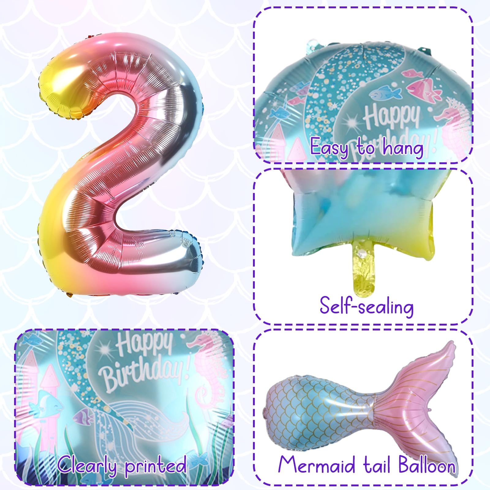 Mermaid Balloons 2Nd Birthday Decorations, 8Pcs Mermaid Party Decorations Balloons, 40 Inch Rainbow Number 2 Balloon, Large Helium Foil Mermaid Tail Balloon, Seashell Balloons For Girls' 2Nd Birthday