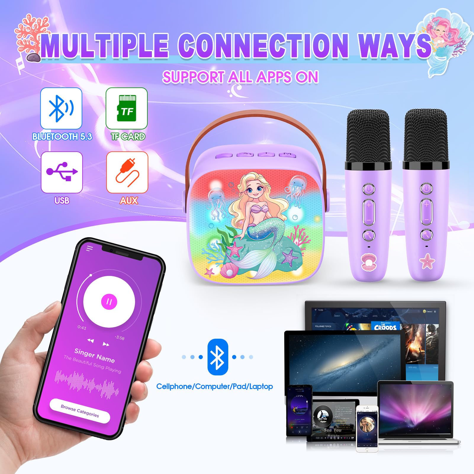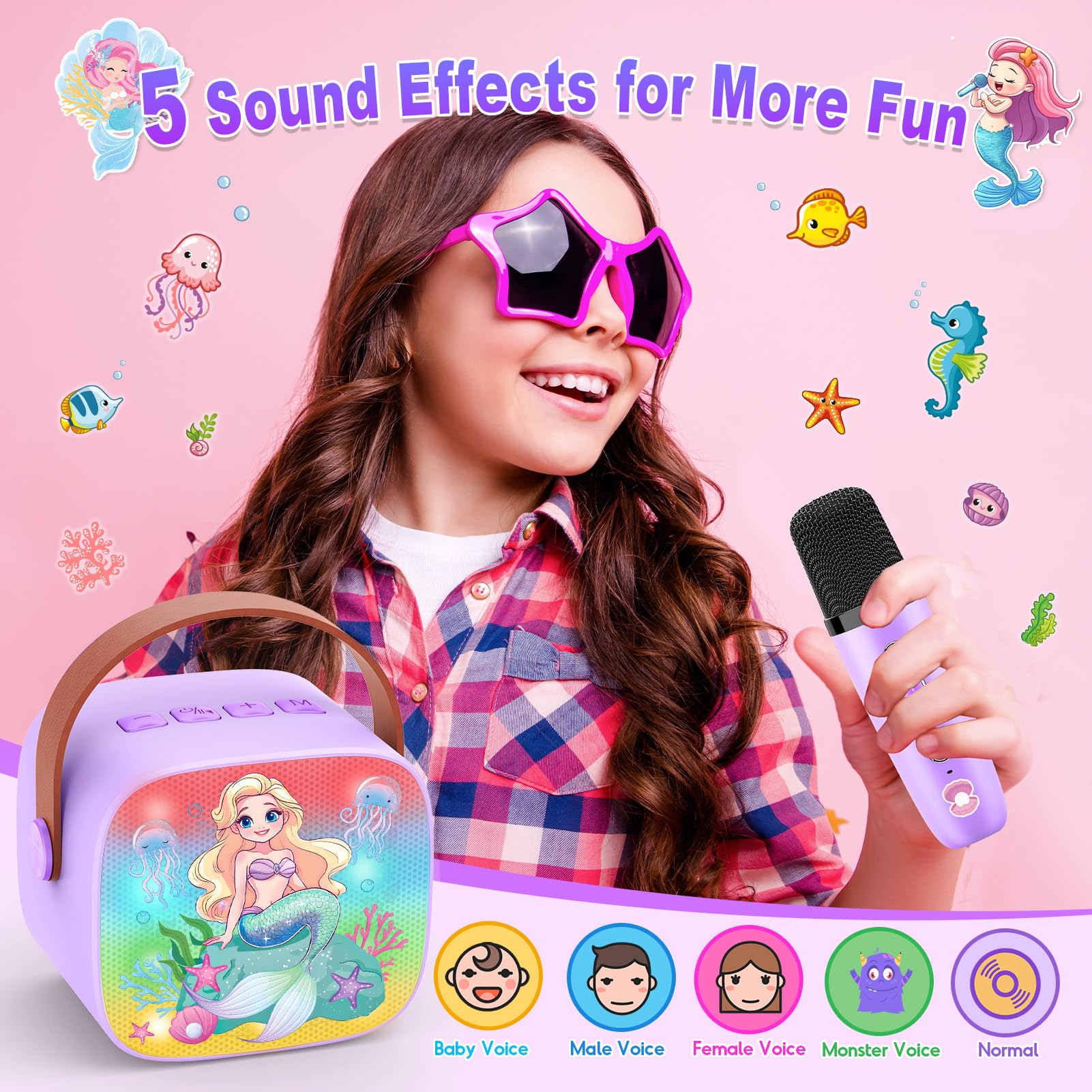 Mermaid Karaoke Microphone Machine Toys: Colorful LED Portable Bluetooth Speaker with 2 Wireless Mics Toys Gifts for 4 5 6 7 8 9 Years Old Girls Kids Birthday Party Gift for Girl Girls Ages 4-12+