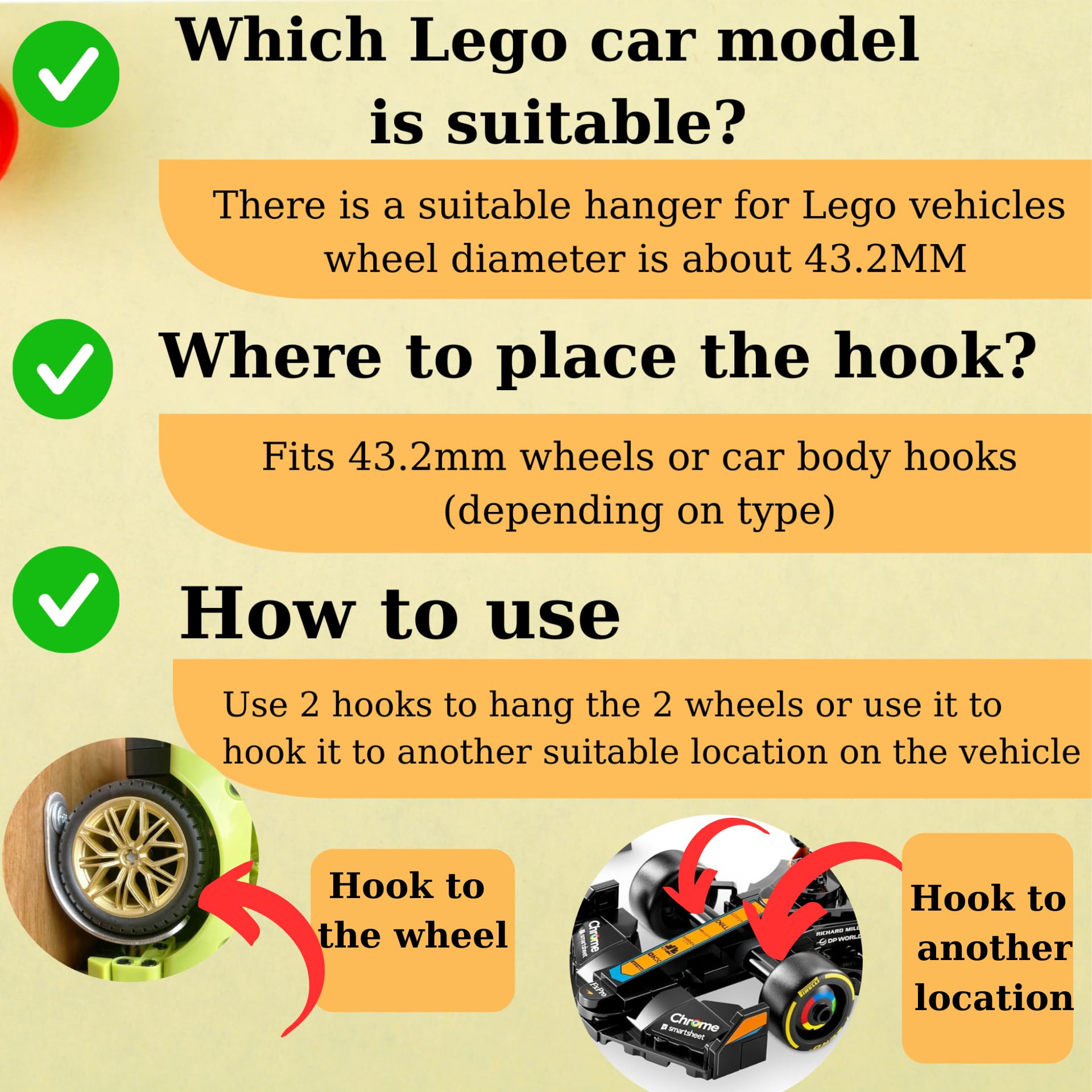 • Q: Can I use this wall mount for other types of models besides Lego cars? A: While this wall mount is specifically designed for Lego cars, its versatile design allows it to accommodate other model cars with similar wheel sizes, making it a great choice for displaying various car models in your collection.